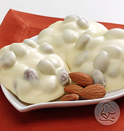 Λιώνουμε τη λευκή σοκολάτα σε ένα μπωλ. Ρίχνουμε ολόκληρα τα ωμά αμύγδαλα και ανακατεύουμε. Ψαρεύουμε αμύγδαλα μαζί με σοκολάτα και τα τοποθετούμε σαν βουναλάκια σε ένα σουπλά. Τα αφήνουμε να κρυώσουν 1-2 ώρες.