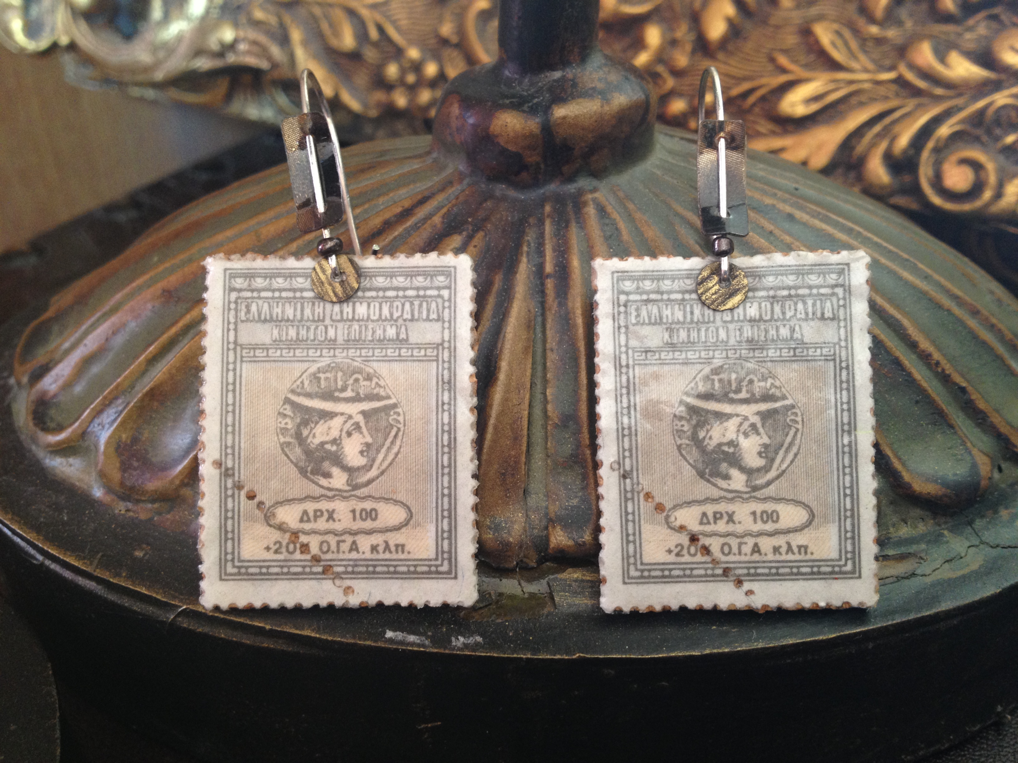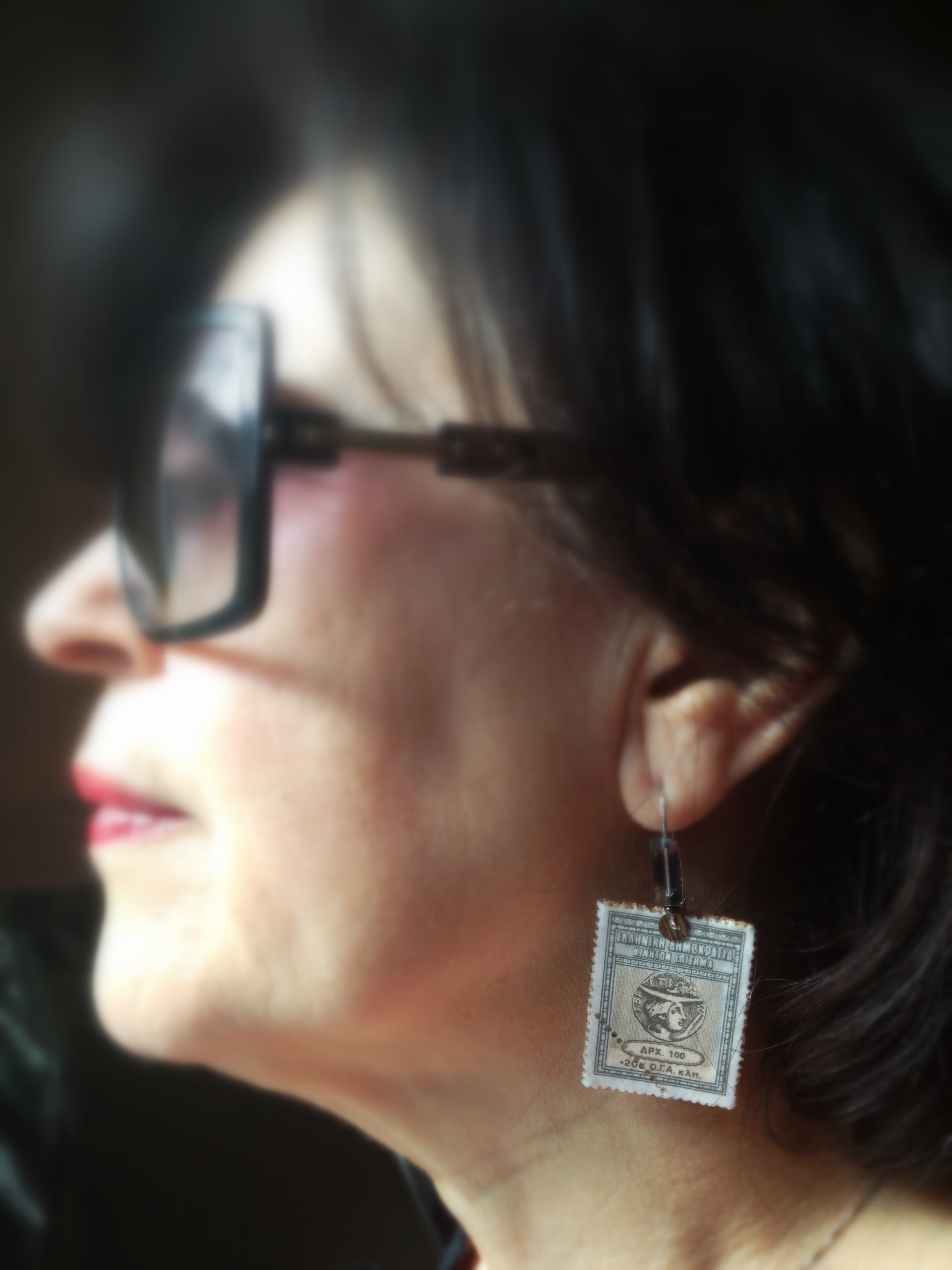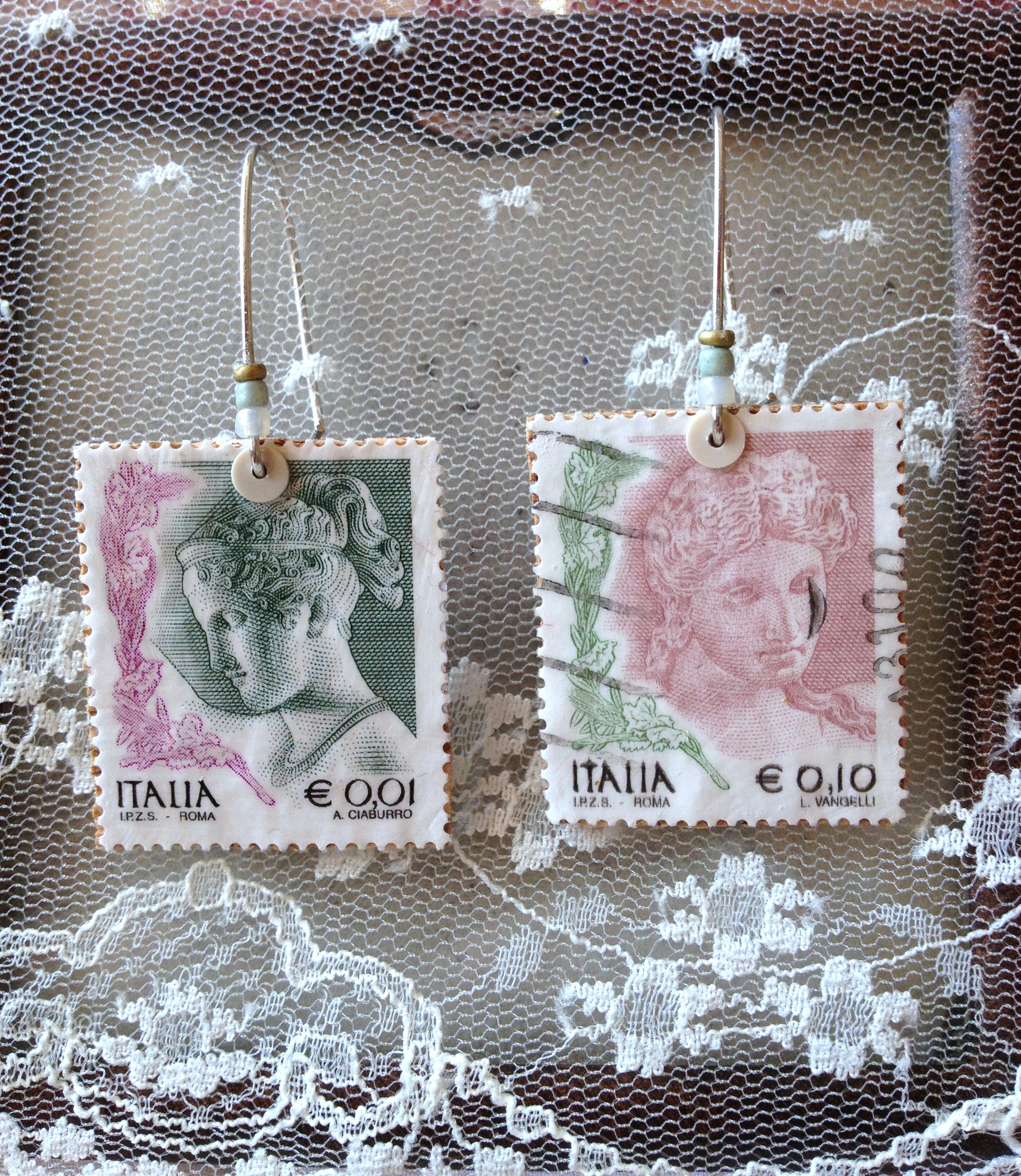 Ιδιαίτερα χειροποίητα σκουλαρίκια, φτιαγμένα απο πραγματικά συλλεκτικά ιταλικά γραμματόσημα που απεικονίζουν γυναικείες κεφαλές της ιταλικής αρχαιότητας. Υλικά όπως χάντρες, φελλός και αλουμίνιο χρησιμοποιήθηκαν για να κατασκευαστούν τρία διαφορετικά σχέδια, καθώς και δύο διαφορετικά σχέδια δαχτυλιδιών που μπορούν να φορεθούν σαν σέτ. Η τιμή του κάθε σέτ σκουλαρικιών είναι 10 ευρώ και του κάθε δαχτυλιδιού 10 ευρώ, στην οποία συμπεριλαμβάνεται, η συσκευασία δώρου και τα έξοδα αποστολής εντός Αττικής. Για οποιαδήποτε επιπλέον πληροφορία και αγορά παρακαλώ επικοινωνήστε στο email της τσούπρας Stevi (hi_stevoni@hotmail.com) με τίτλο τον κωδικό του κάθε δαχτυλιδιού./ Special hand made ear-rings and rings are made of real collectible italian stamps depicting female heads of Italian antiquity. There are three different designs made of aluminium, linoleum and many different beads. The price of each ear-ring and ring is 10 euros (included the gift wrapping but excluded the shipping costs). For further information and purchase please contact the tsoupra Stevi (email:hi_stevoni@hotmail.com) using as email title the code of each ring.