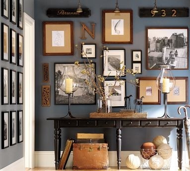 5. Συμμετρία κάδρων (το κάτω άκρο/βάση τους βρίσκεται πάνω σε μια νοητή γραμμή) ανεξάρτητα απο το μέγεθός τους. Γλυκό καλωσόρισμα με οικογενειακές φωτογραφίες σε είσοδο σπιτιού. Αυτός ο τρόπος βολεύει και για τοποθέτηση κάδρων πάνω απο κάποιο μπουφέ ή τραπέζι κουζίνας. (minimal, classic)