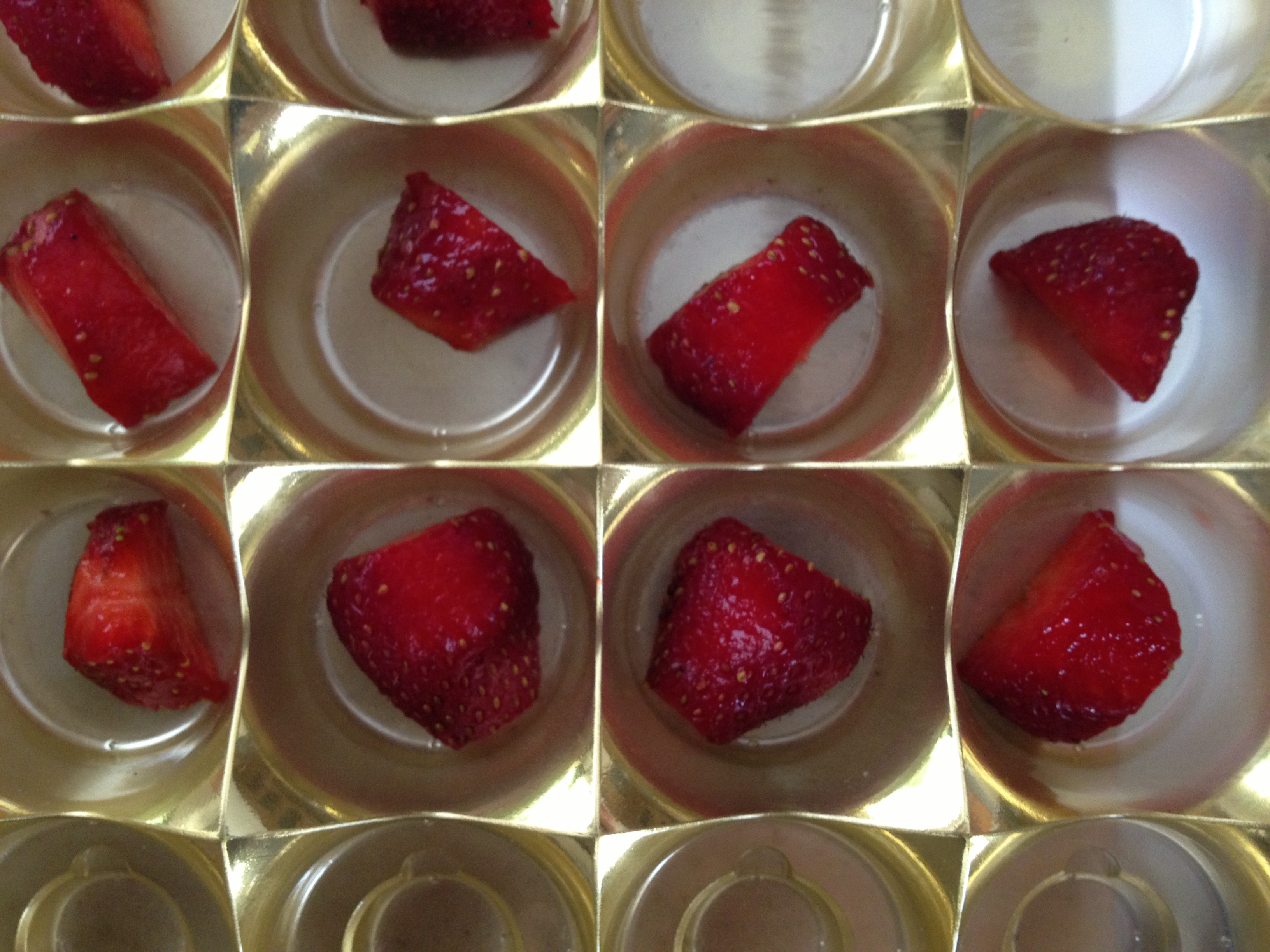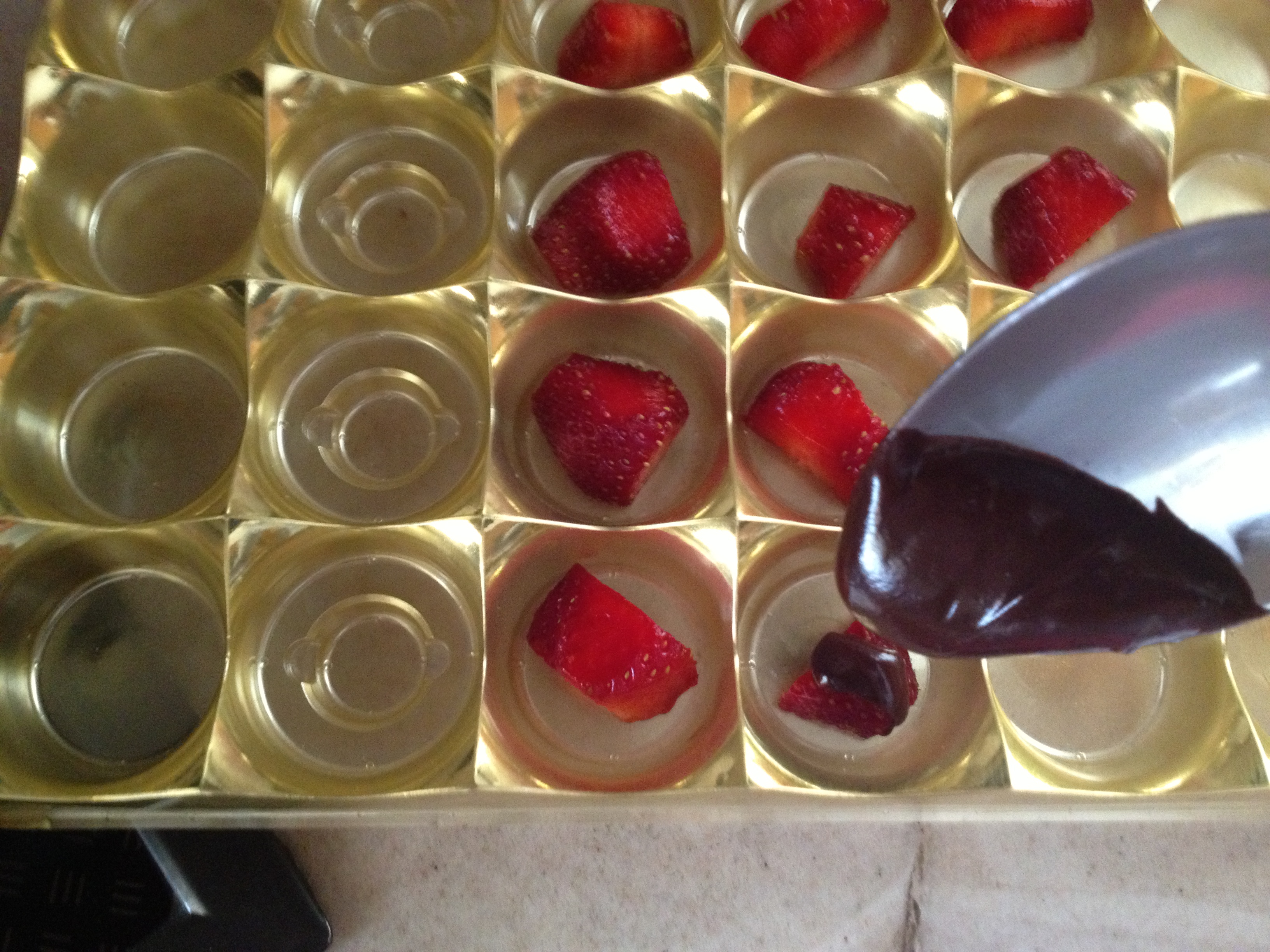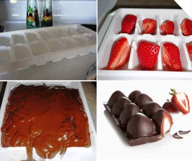 Αυτή την εποχή το ιδανικό σοκολατάκι μπορεί να περιλαμβάνει το φρούτο της άνοιξης, την αγαπημένη σε όλους φράουλα! Αγοράστε λοιπόν απο το μανάβη της γειτονιάς σας ένα καλαθάκι φράουλες, πλύντε τις και καθαρίστε τις (αφαιρώντας φυσικά και το κοτσάνι). Αν θέλετε μπορείτε να τις χρησιμοποιήσετε ολόκληρες ή σε κομματάκια. Αφήστε τις να στεγνώσουν καλά (για να μην έχουν υγρά) και τοποθετήστε τις σε παγοκύστες ή θήκες ειδικές για σοκολατάκια (οι θήκες σιλικόνης δεν με βόλεψαν)./ You can try to make little chocolates stuffed with strawberry by using 2 melted dust-wrapper (chocolate) bars and strawberry or any kind of fruit! Fill a choco kind of tin-mould with the melted chocolate n’ the strawberries and put them in the fridge. Wait for 2-3 hours and …. start tasting with a glass of wine!!!