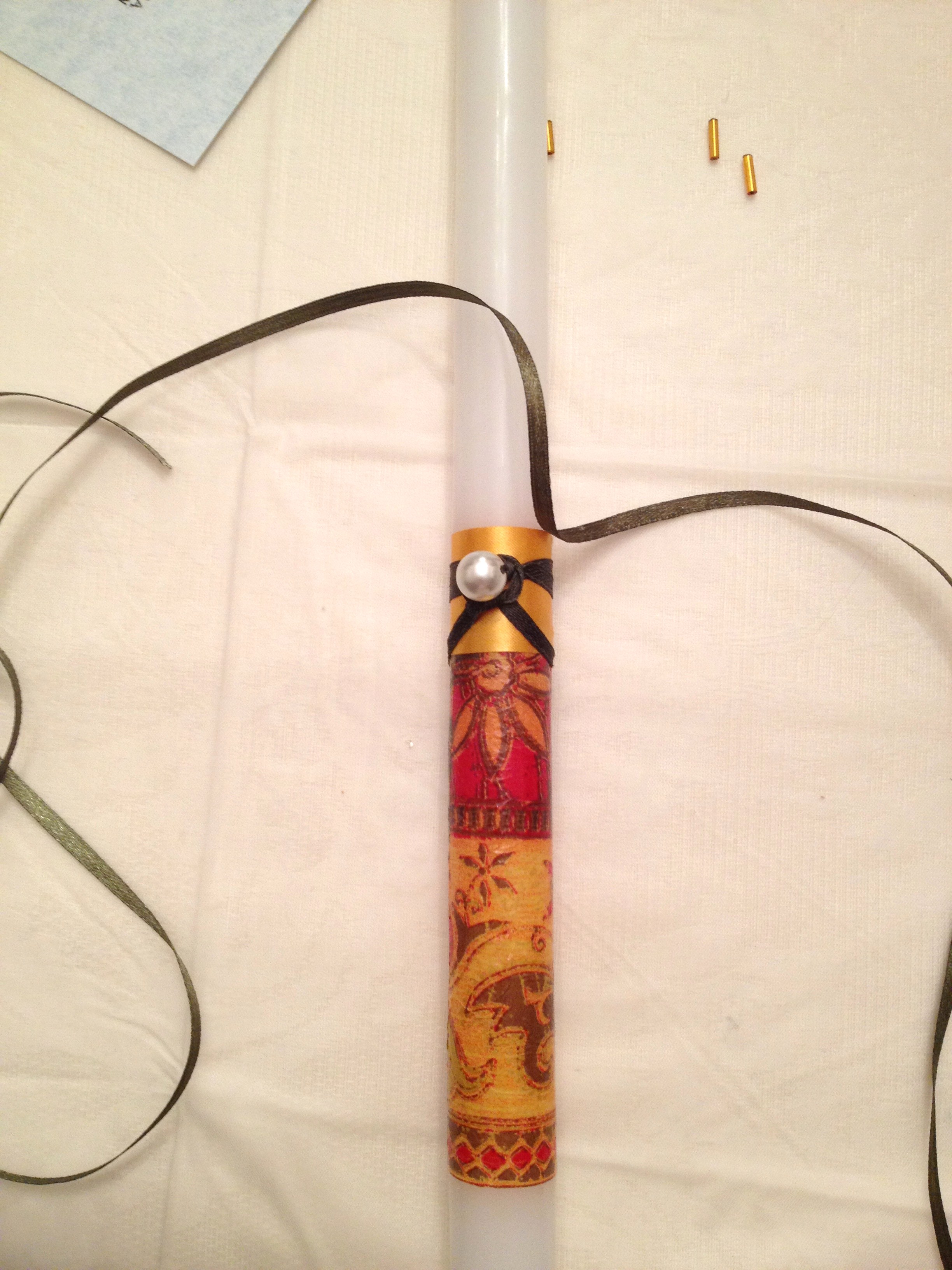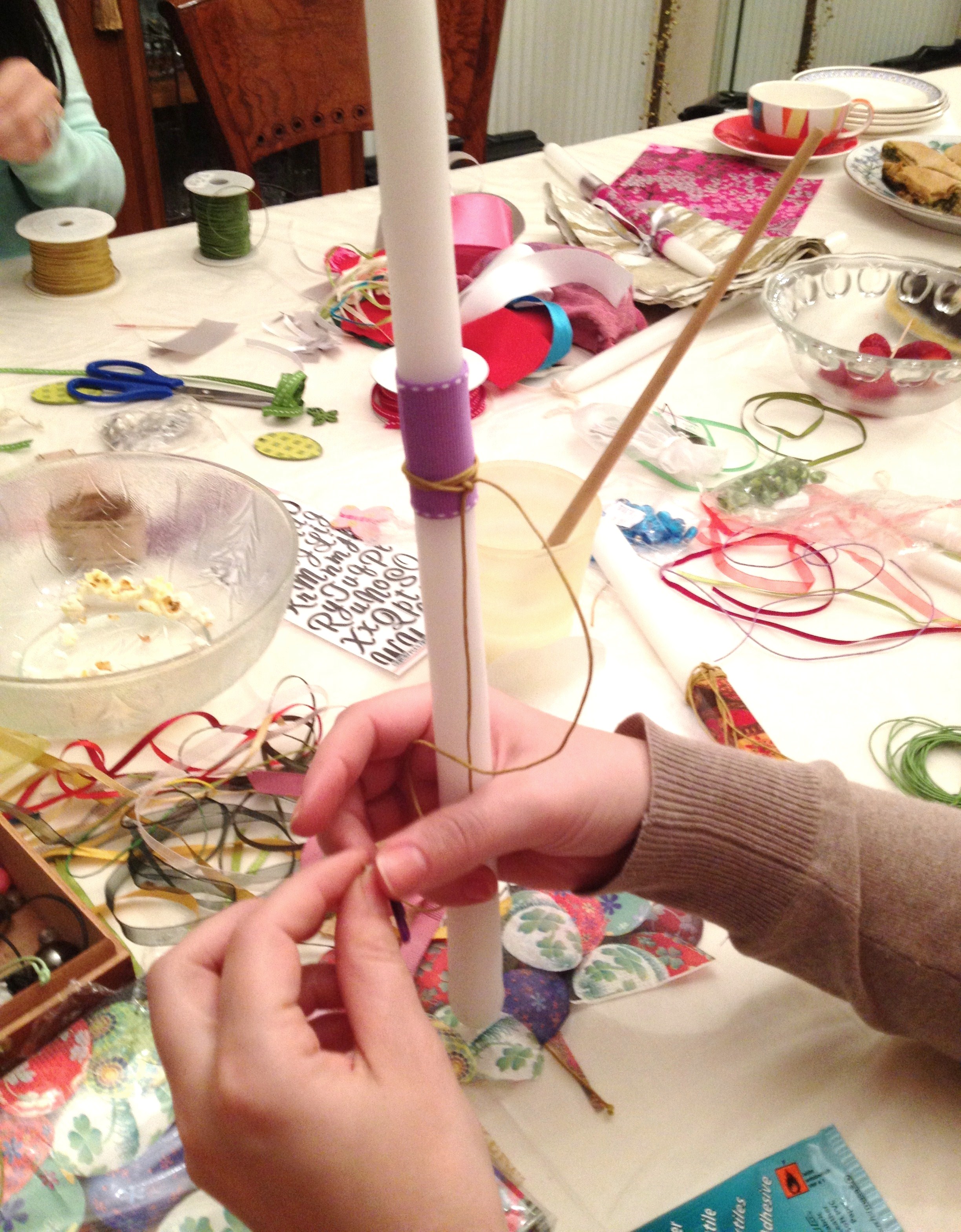 Γύρω απο ένα μεγάλο τραπέζι άρχισε και συνεχίστηκε για ώρες ολόκληρες ένα δημιουργικό πανηγύρι! Συγκεντρώσαμε πρώτα τα υλικά μας, κάποια τα αγοράσαμε, κάποια άλλα τα βρήκαμε σε συρτάρια και μπαούλα. Κορδέλες, χαρτί ντεκουπάζ, χαρτοπετσέτες, χάντρες και μικρά διακοσμητικά περνούσαν από χέρι σε χέρι ενώ παλεύαμε να μεταμορφώσουμε τα λευκά κεριά μας, σε πρωτότυπες πασχαλινές λαμπάδες για μικρούς και μεγάλους. Συγκεντρώστε κι εσείς τα δικά σας και αρχίζουμε…