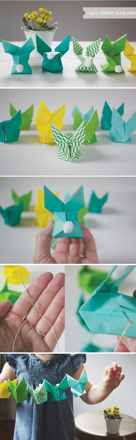 – Αν σου άρεσε η τσουπροπρόταση για γιρλάντες, τα origami λαγουδάκια γίνονται μία πανέμορφη γιρλάντα. Προμηθεύσου μόνο χρωματιστά χαρτιά και σπάγγο.