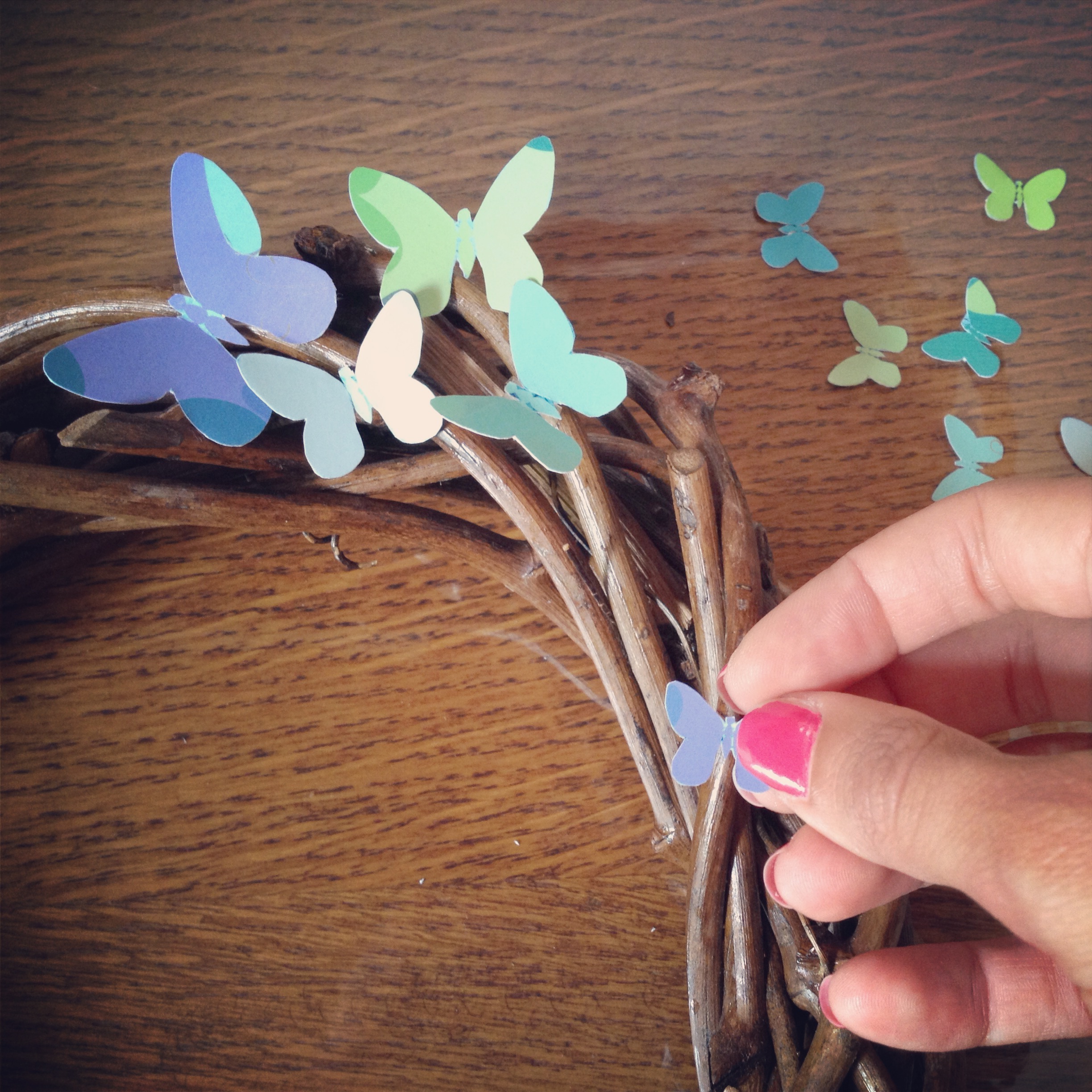 - απο χοντρές σελίδες περιοδικών έκοψα πεταλούδες σε διάφορα μεγέθη (με παρόμοιους χρωματικούς τόνους)