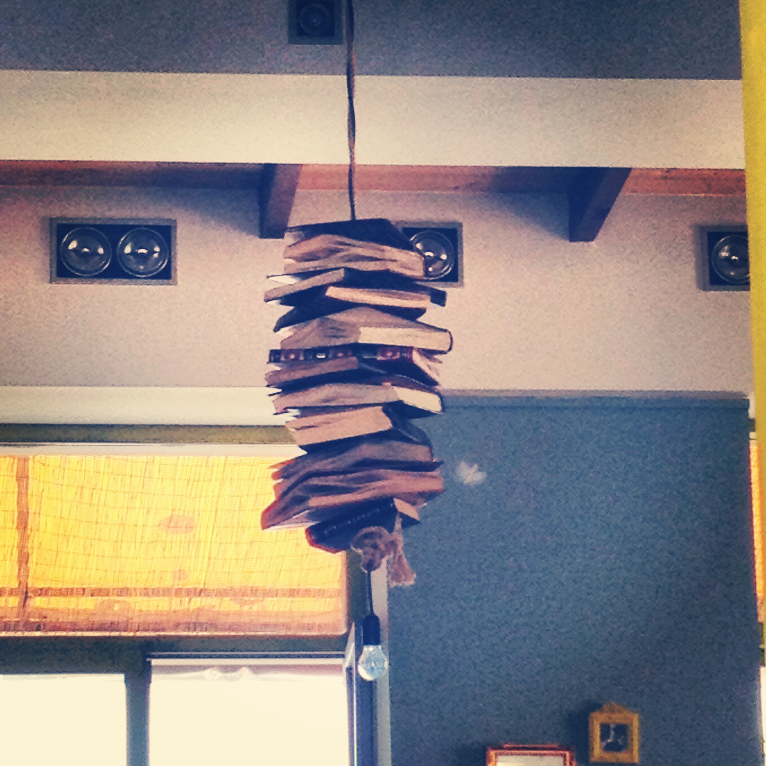 Αν συγκαταλέγεστε στους δεινούς βιβλιοσυλλέκτες που ψάχνουν συνεχώς νέους χώρους να στoiβάξουν τα χιλιάδες βιβλία τους, γιατί να μην τολμίσετε να κρεμάσετε βιβλία δημιουργώντας ένα φωτιστικό! Πολύ καλή ιδέα για χώρο γραφείου/βιβλιοθήκης ή παιδικού δωματίου, χρησιμοποιόντας χρωματιστά βιβλία με παραμύθια! Θα χρειαστείτε ένα καλώδιο, ένα ντουί, μια οικολογική λάμπα, πολλά βιβλία και χοντρό σχοινί για να τα στερεώσετε. Απλά φτιάξτε μια χοντρή τρύπα που θα διαπερνά το κάθε βιβλίο και απο το οποίο θα περνά το καλώδιο. Τέλος επιλέξτε αν τα θέλετε ανοικτά ή κλειστά 🙂