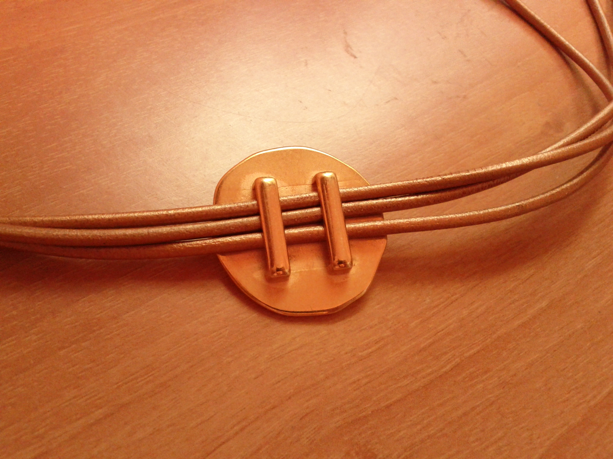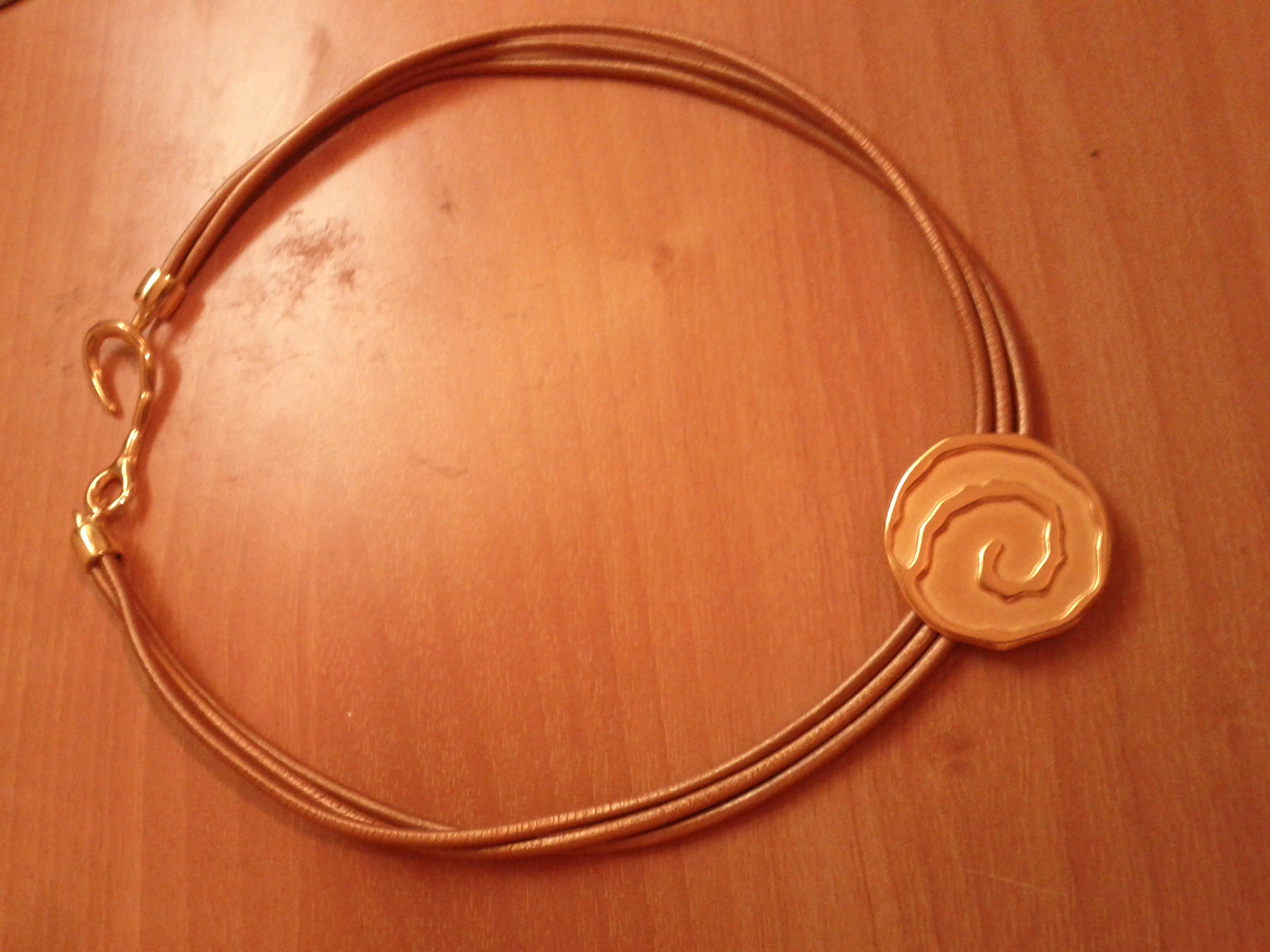 Όλα ξεκίνησαν με μία βόλτα στην Αθηνάς. Σε ένα από τα μαγαζάκια της βρήκα ένα χοντρό δερμάτινο κορδόνι σε καταπληκτικό ροζ χρυσό χρώμα. Και αμέσως σκέφτηκα ότι θα ήταν πολύ όμορφο σε κολιέ. Αγόρασα 1 μέτρο και …. τα υπόλοιπα ήρθαν φυσικά.