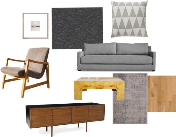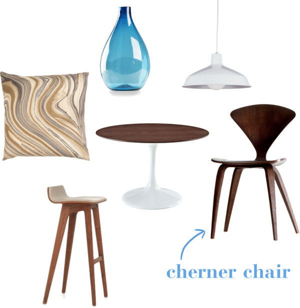 Προσέξτε το focal point στο καθιστικό με το λευκό έργο τέχνης στον σκούρο τοίχο τοίχο. Ενδιαφέρουσα η μίξη μπεζ με γκρι, όπως και των διαφόρων ξύλων (καρυδιά, κερασιά, wenge, φελλός). Φανταστική επιλογή οι cherner καρέκλες στη κουζίνα.
