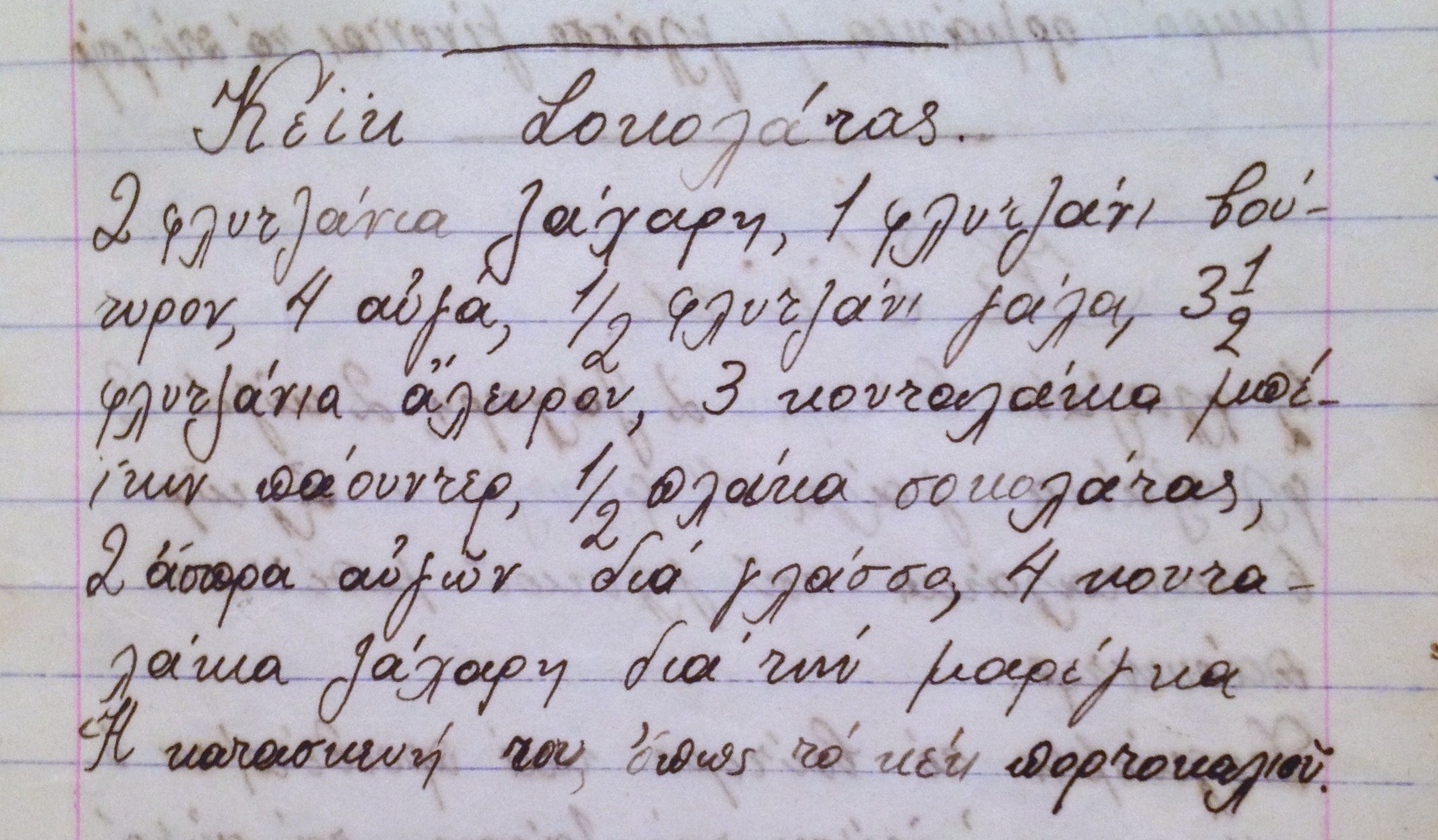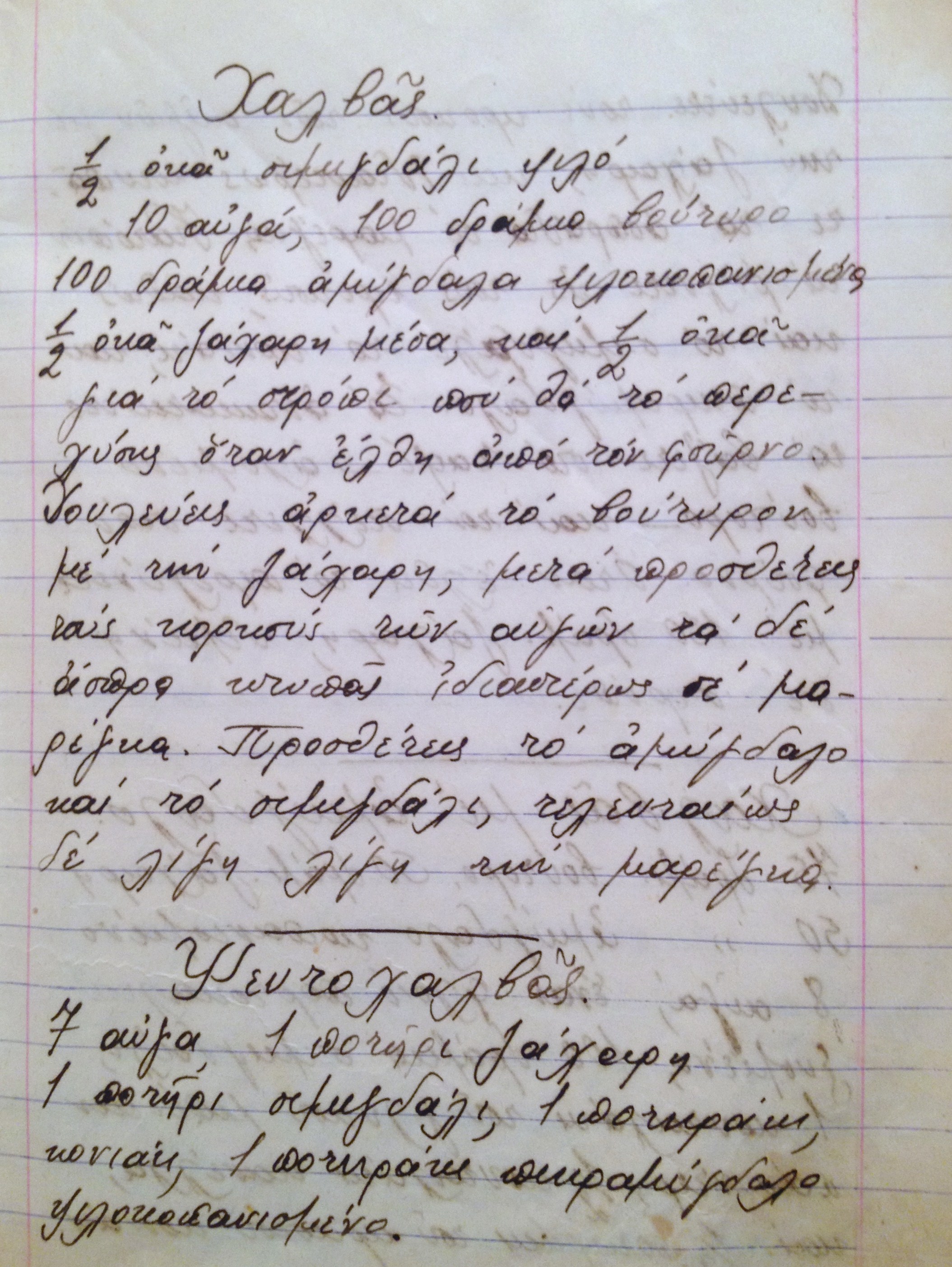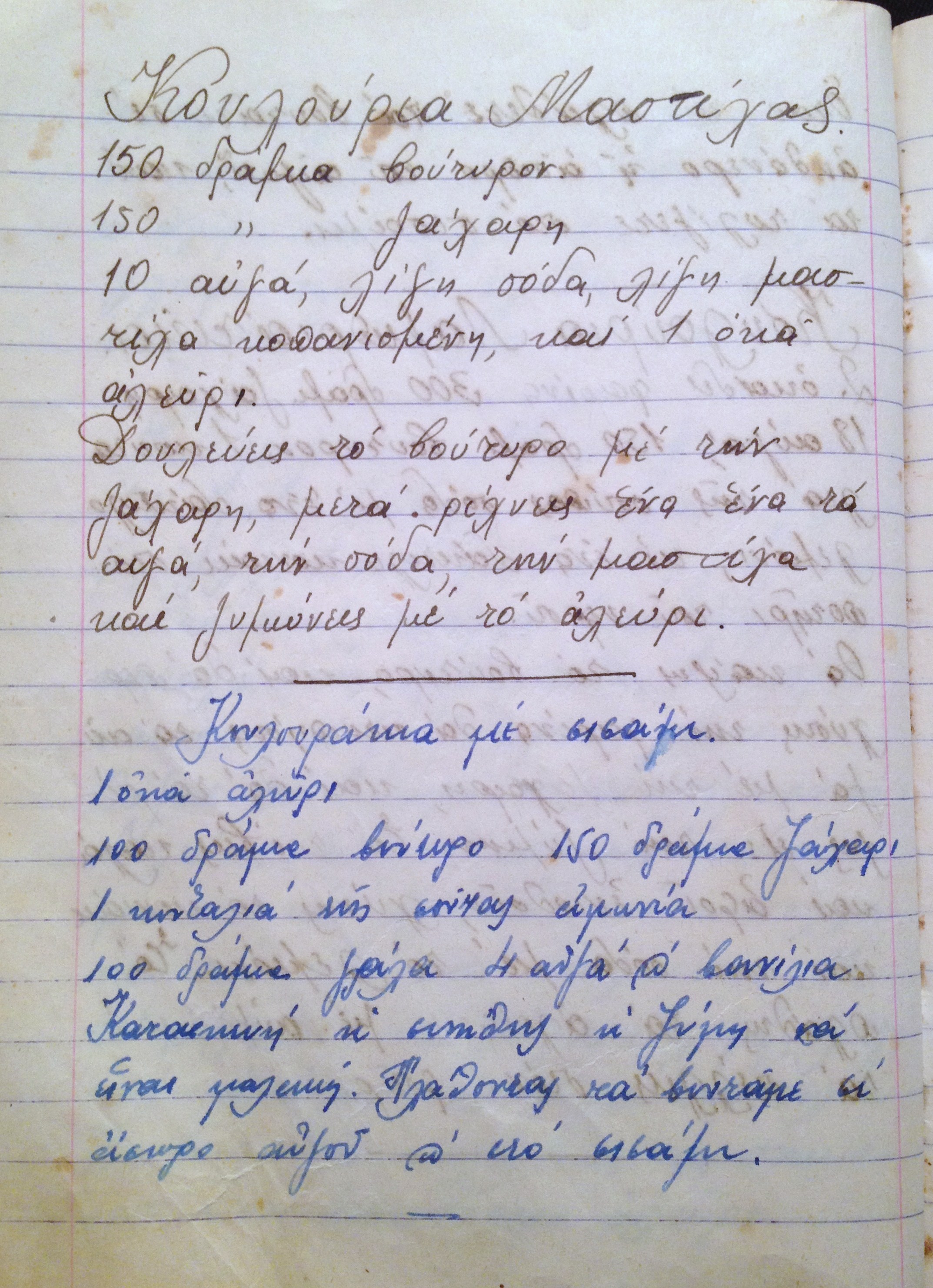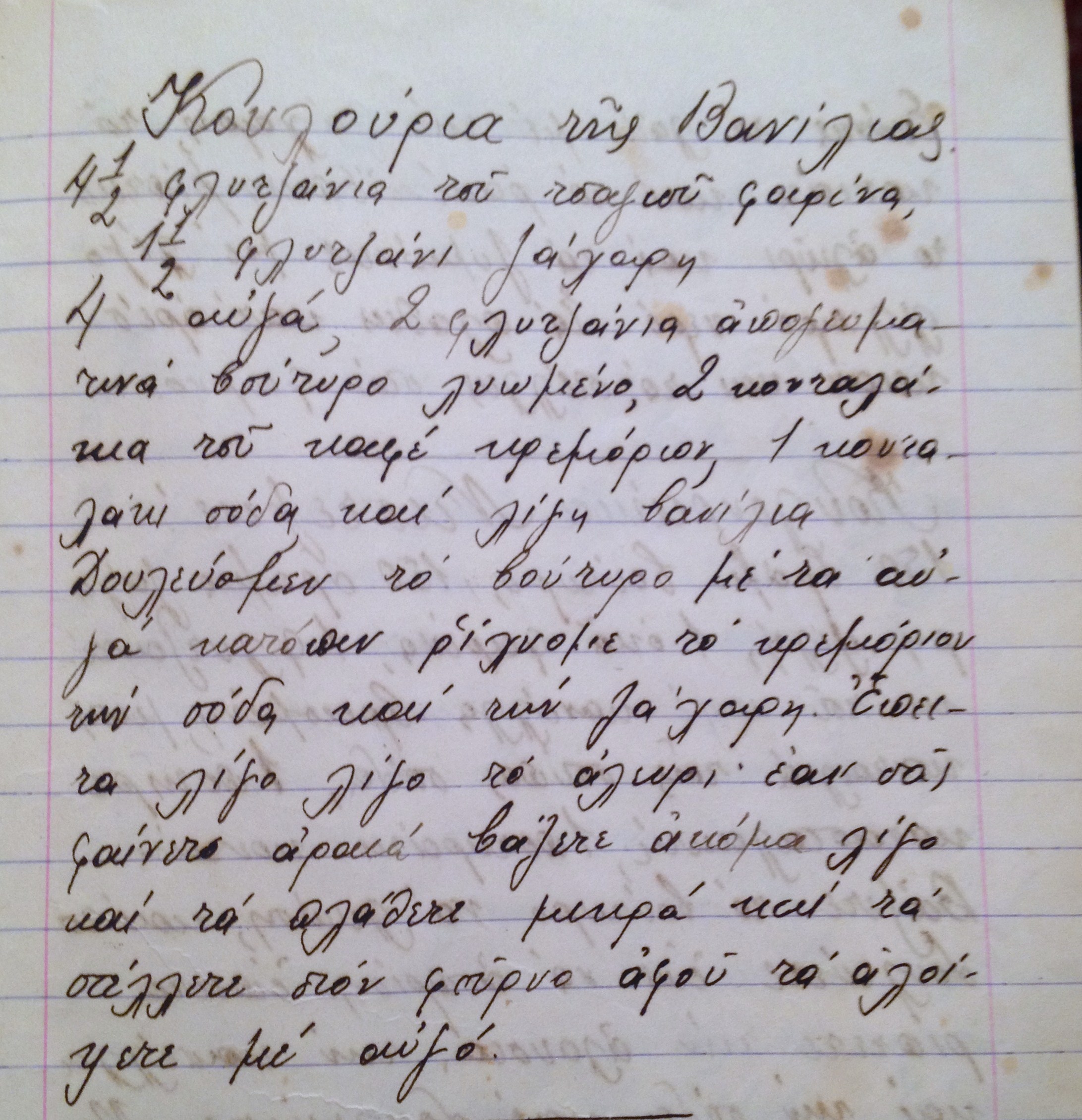 Πριν λίγες μέρες σε ένα φιλικό σπίτι η συζήτηση πάλι κατέληξε στο φαγητό… Η νοικοκυρά, χρυσοχέρα και πολύ καλή μαγείρισσα, μου αποκάλυψε οτι αυτό της το ταλέντο το οφείλει στη γιαγιά της απο τη Χίο! Μια έκπληξη με περίμενε μετά απο λίγο, όταν έφερε να μου δείξει ένα παλιό βιβλίο συνταγών ζαχαροπλαστικής της γιαγιάς της το οποίο ήταν της εποχής του ’50!