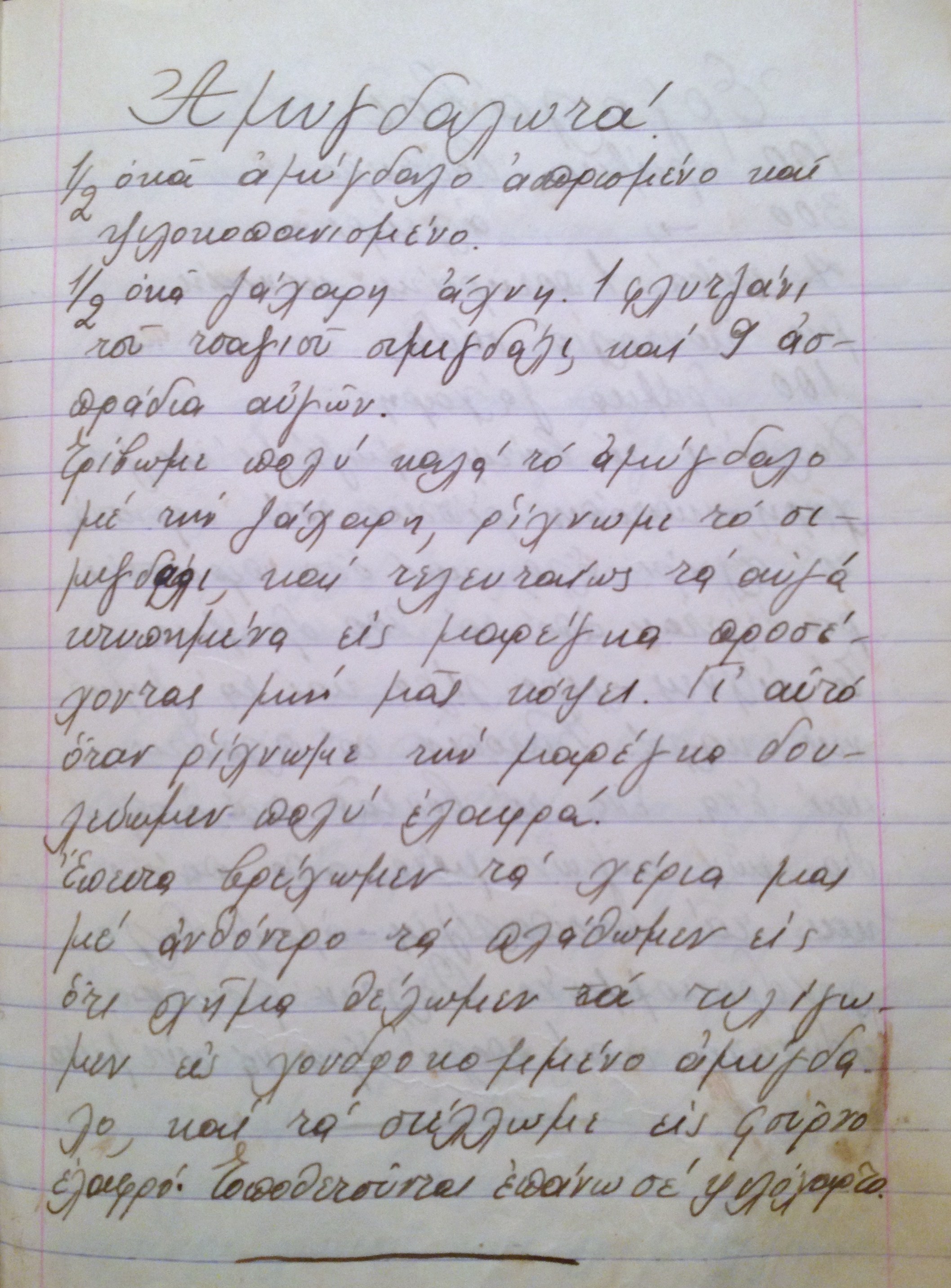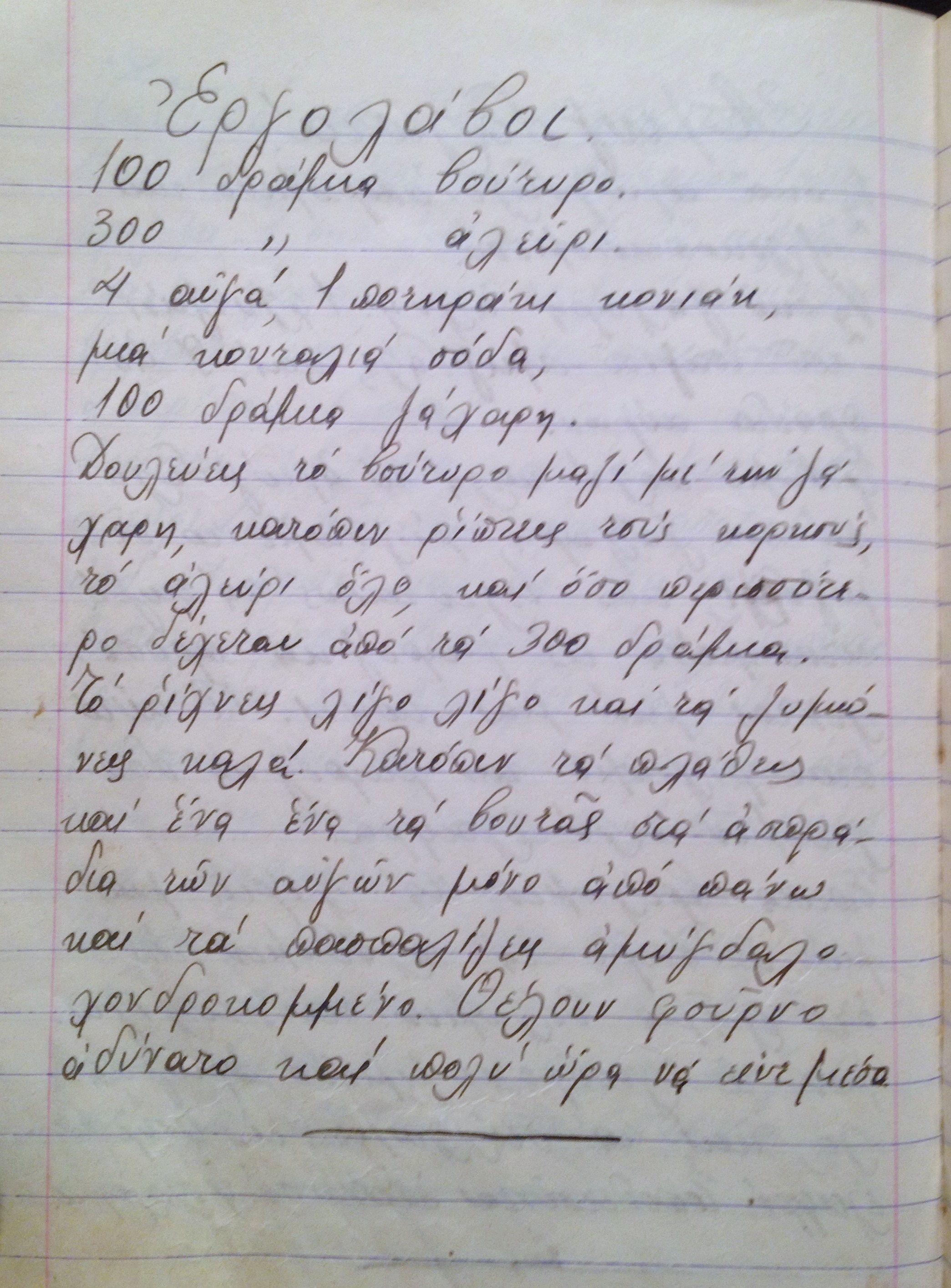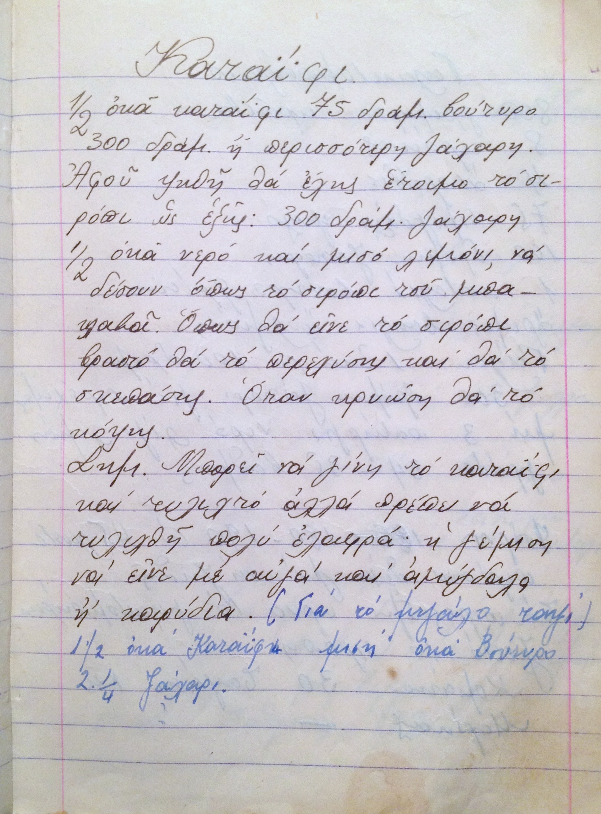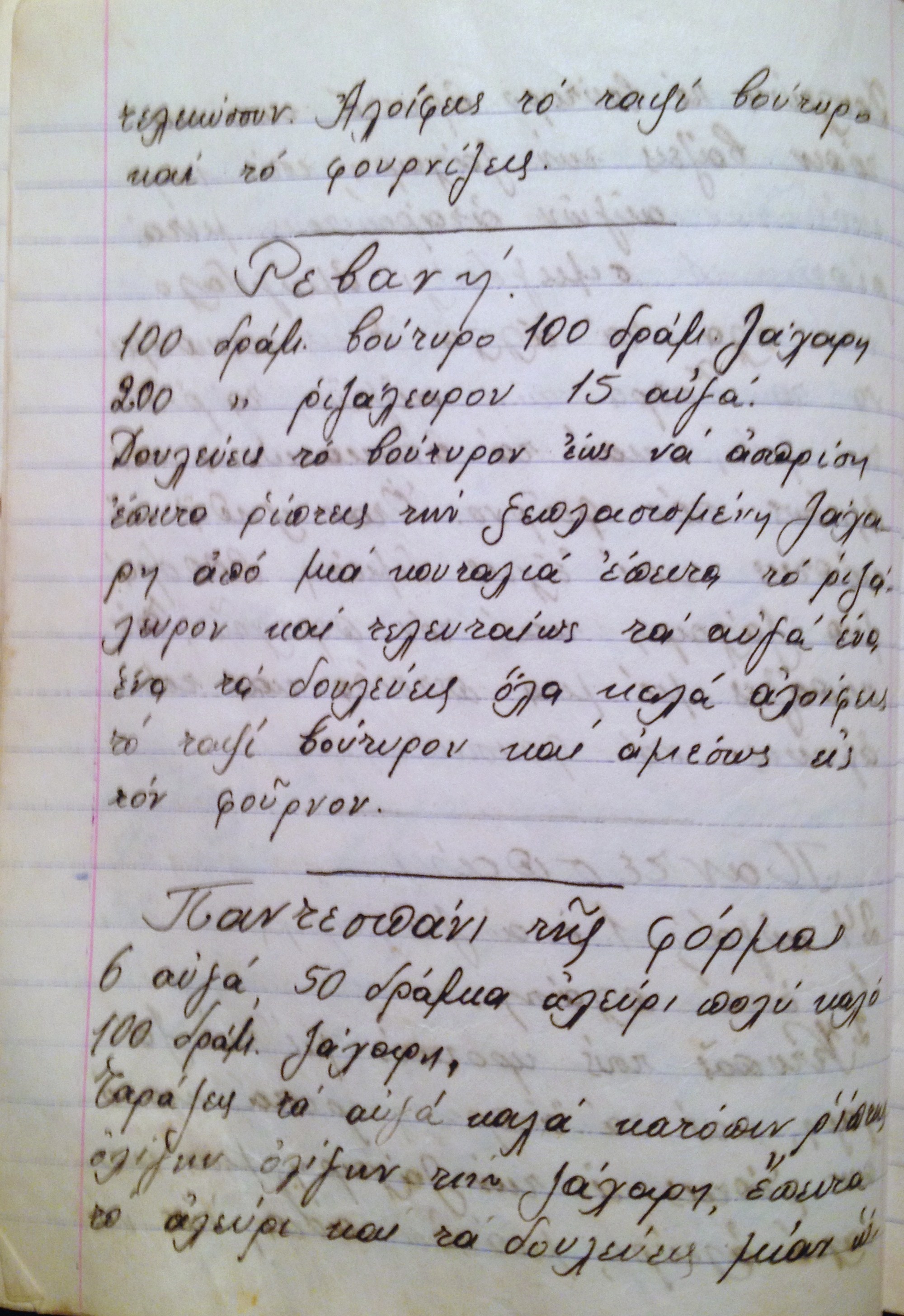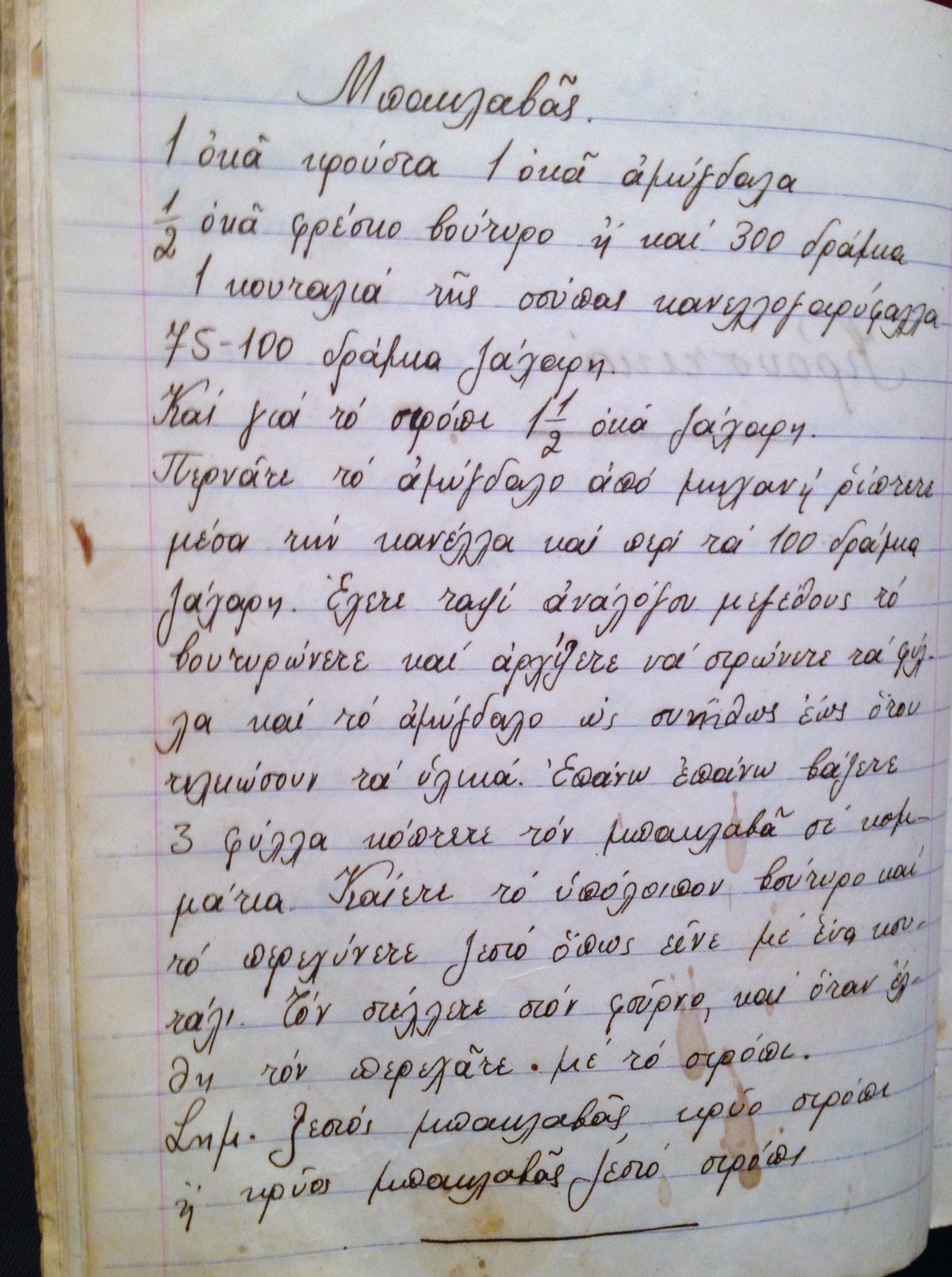 Πριν λίγες μέρες σε ένα φιλικό σπίτι η συζήτηση πάλι κατέληξε στο φαγητό… Η νοικοκυρά, χρυσοχέρα και πολύ καλή μαγείρισσα, μου αποκάλυψε οτι αυτό της το ταλέντο το οφείλει στη γιαγιά της απο τη Χίο! Μια έκπληξη με περίμενε μετά απο λίγο, όταν έφερε να μου δείξει ένα παλιό βιβλίο συνταγών ζαχαροπλαστικής της γιαγιάς της το οποίο ήταν της εποχής του ’50!
