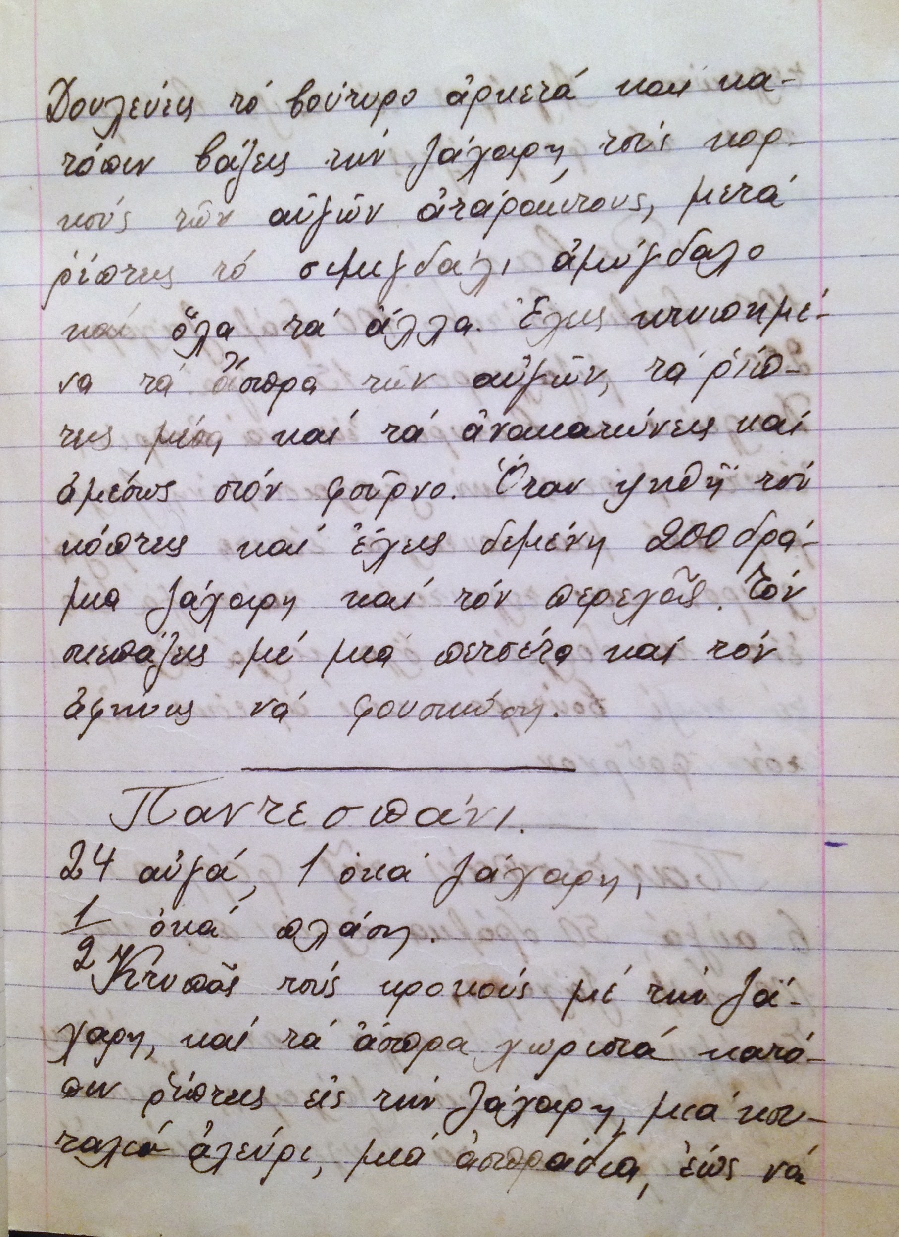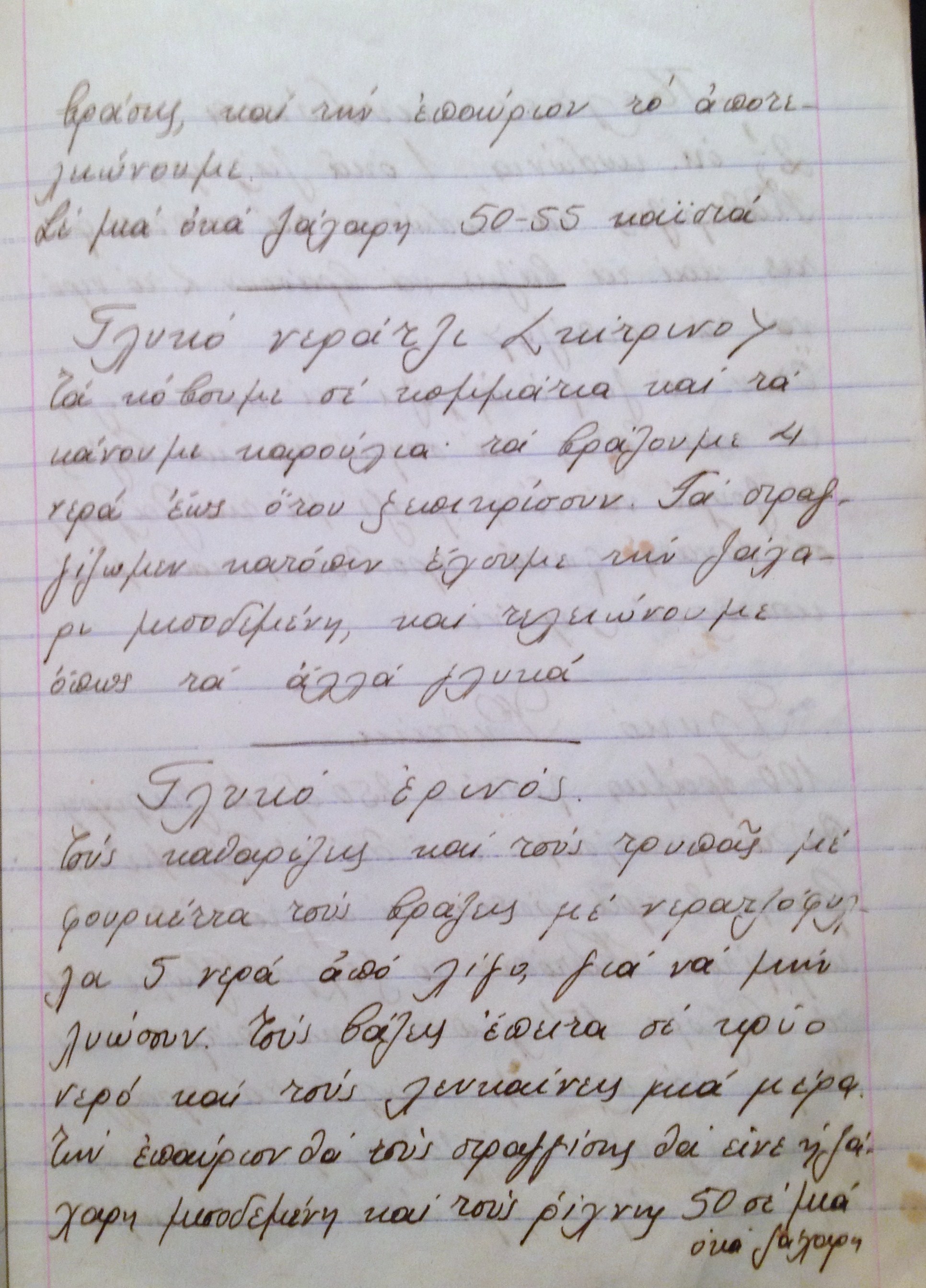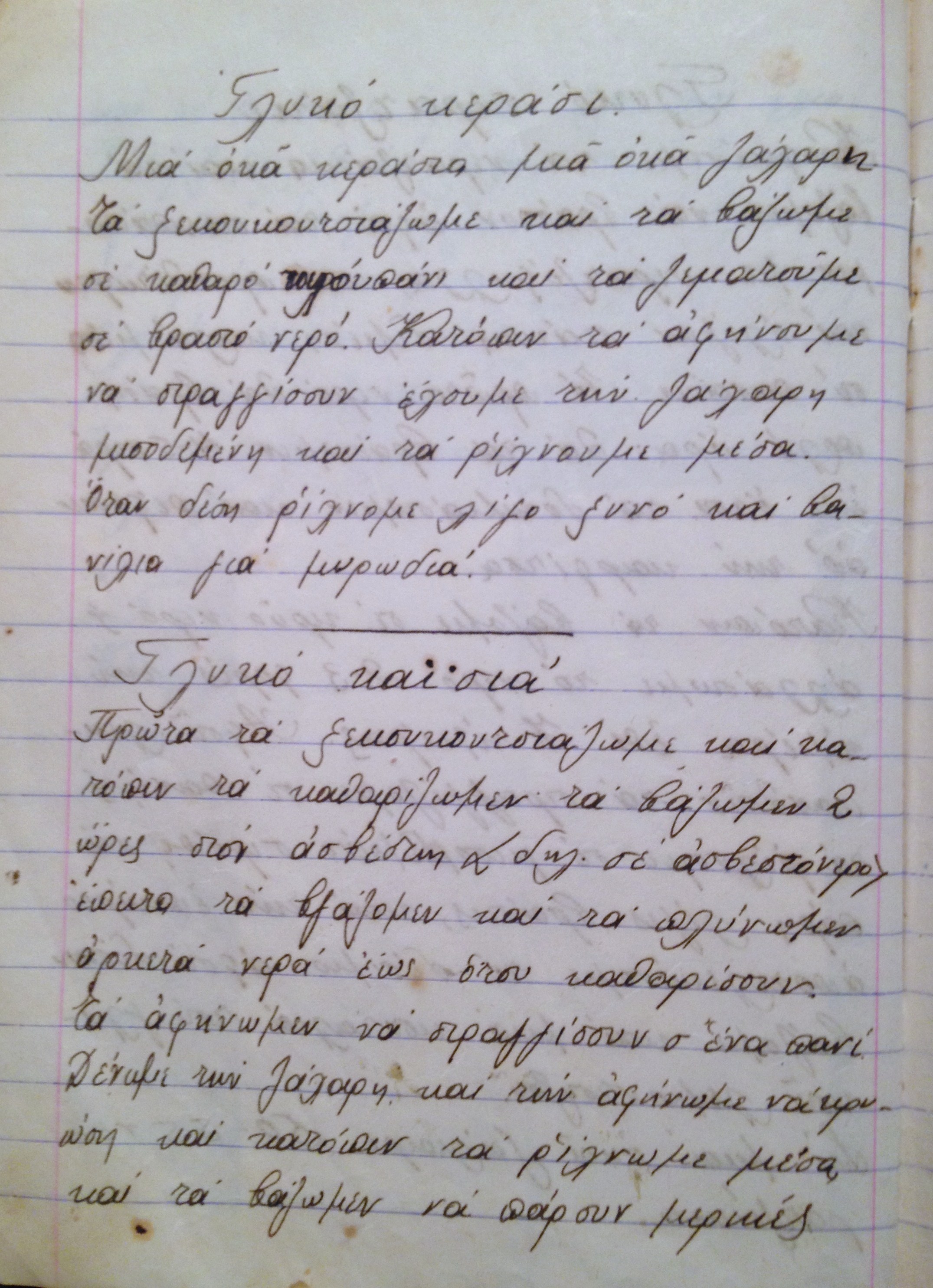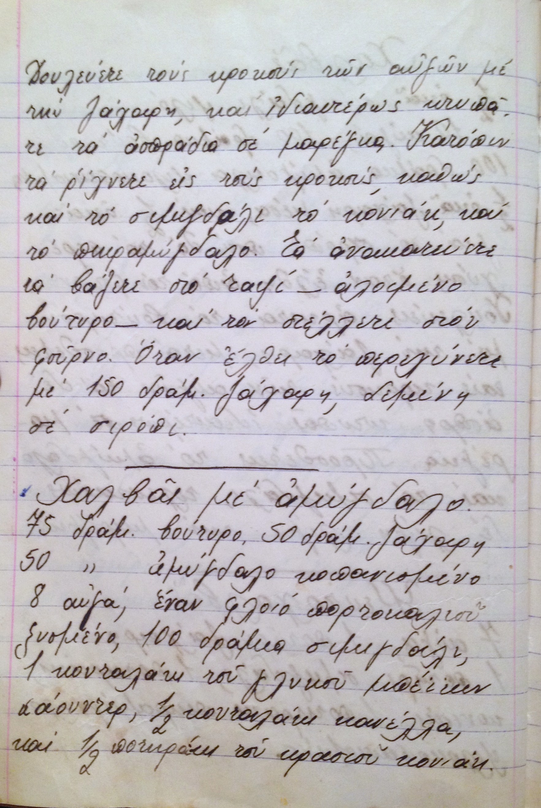 Πριν λίγες μέρες σε ένα φιλικό σπίτι η συζήτηση πάλι κατέληξε στο φαγητό… Η νοικοκυρά, χρυσοχέρα και πολύ καλή μαγείρισσα, μου αποκάλυψε οτι αυτό της το ταλέντο το οφείλει στη γιαγιά της απο τη Χίο! Μια έκπληξη με περίμενε μετά απο λίγο, όταν έφερε να μου δείξει ένα παλιό βιβλίο συνταγών ζαχαροπλαστικής της γιαγιάς της το οποίο ήταν της εποχής του ’50!