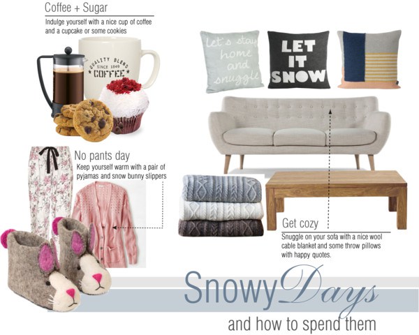 Φτιάχνουμε καφέ ή την τέλεια σοκολάτα, σερβίρουμε σε σικ φλυτζάνι μαζί με κάποιο cupcake ή cookies, δίπλα στον καναπέ. Φοράμε τις πυζάμες μας, ξαπλώνουμε και σκεπαζόμαστε με μία κουβέρτα. Ανοίγουμε ένα καλό βιβλίο και διαβάζουμε με τις ώρες, μέχρι να κουραστούμε. Ενίοτε ρίχνουμε κλεφτές ματιές από το παράθυρο και χαζευουμε το χιονι που πέφτει.