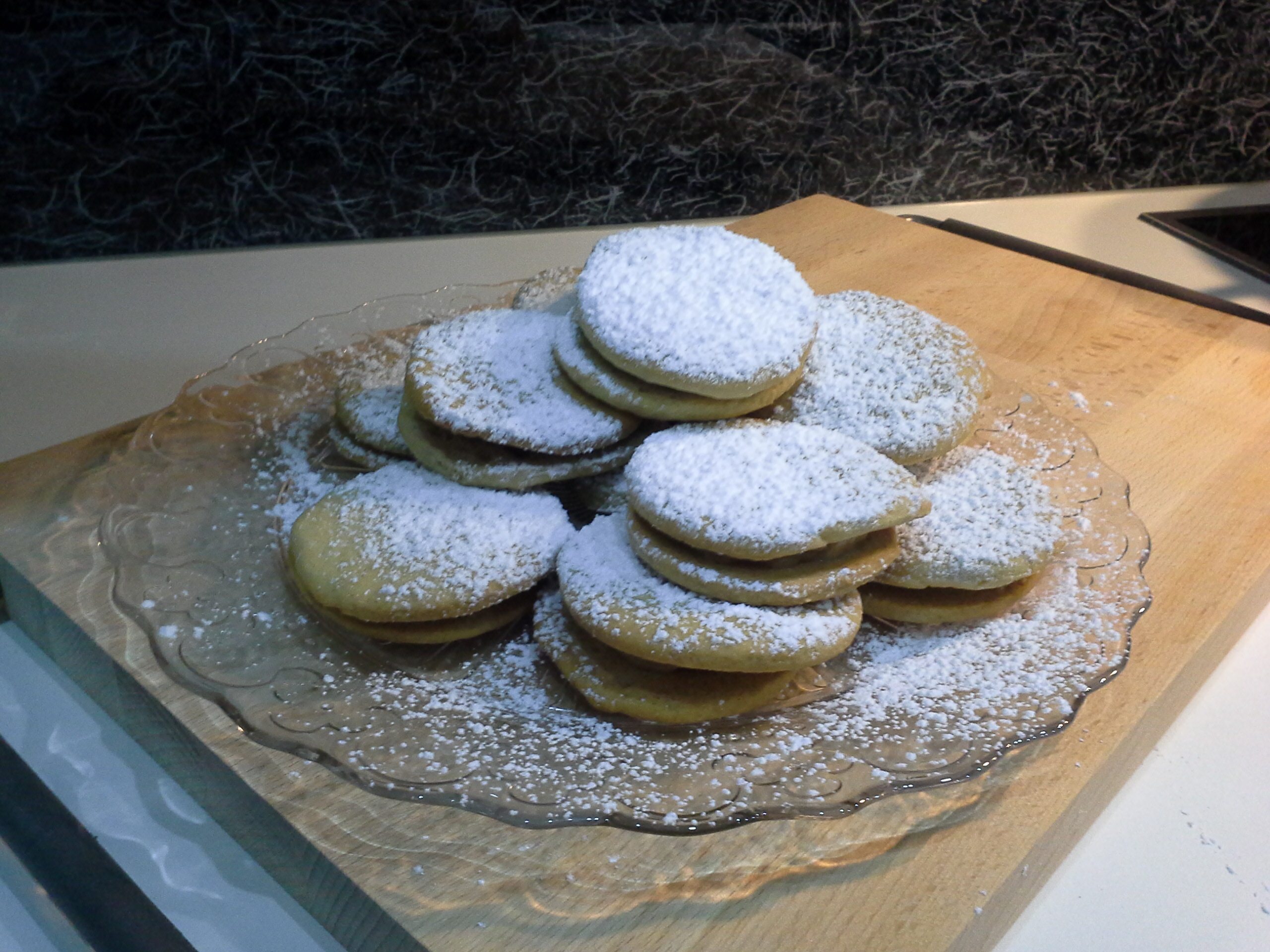 Όταν κρυώσουν τα μπισκότα μας, βάζουμε ανάμεσα τους λίγη από την κρέμα με έναν κορνέ και τα πασπαλίζουμε με ζάχαρη άχνη.