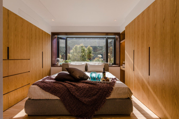Οι μεγάλες ξύλινες κάσες των παραθύρων πλαισιώνουν τη θέα, ακόμα ένα τρικ για την εστίαση στο εξωτερικό περιβάλλον. Και φυσικά, καθόλου κουρτίνες!