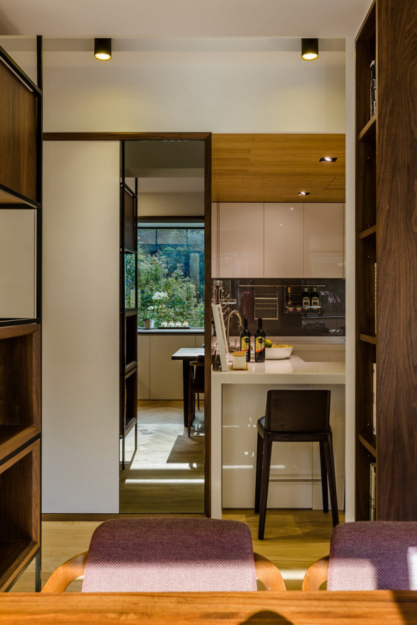 Στην κουζίνα, ντούλαπια απο λευκή λάκα συνδυάστηκαν με υποτονική απόχρωση του μωβ στους τοίχους και μοντέρνο πάτωμα από πλακίδια σε διάφορα σχέδια που δημιουργούν μωσαϊκό.