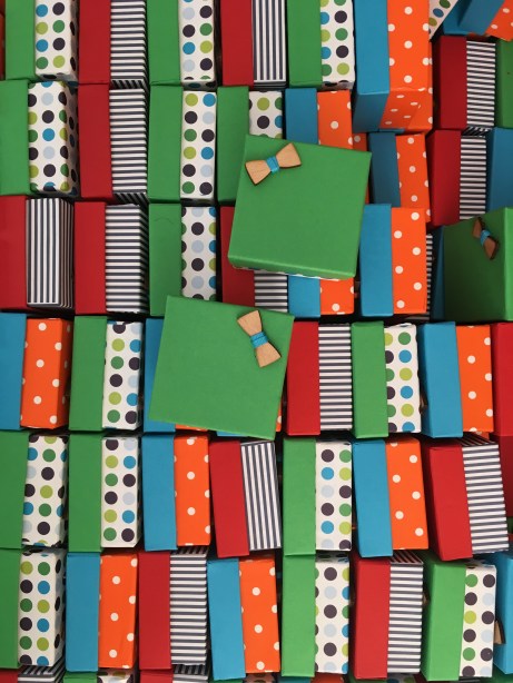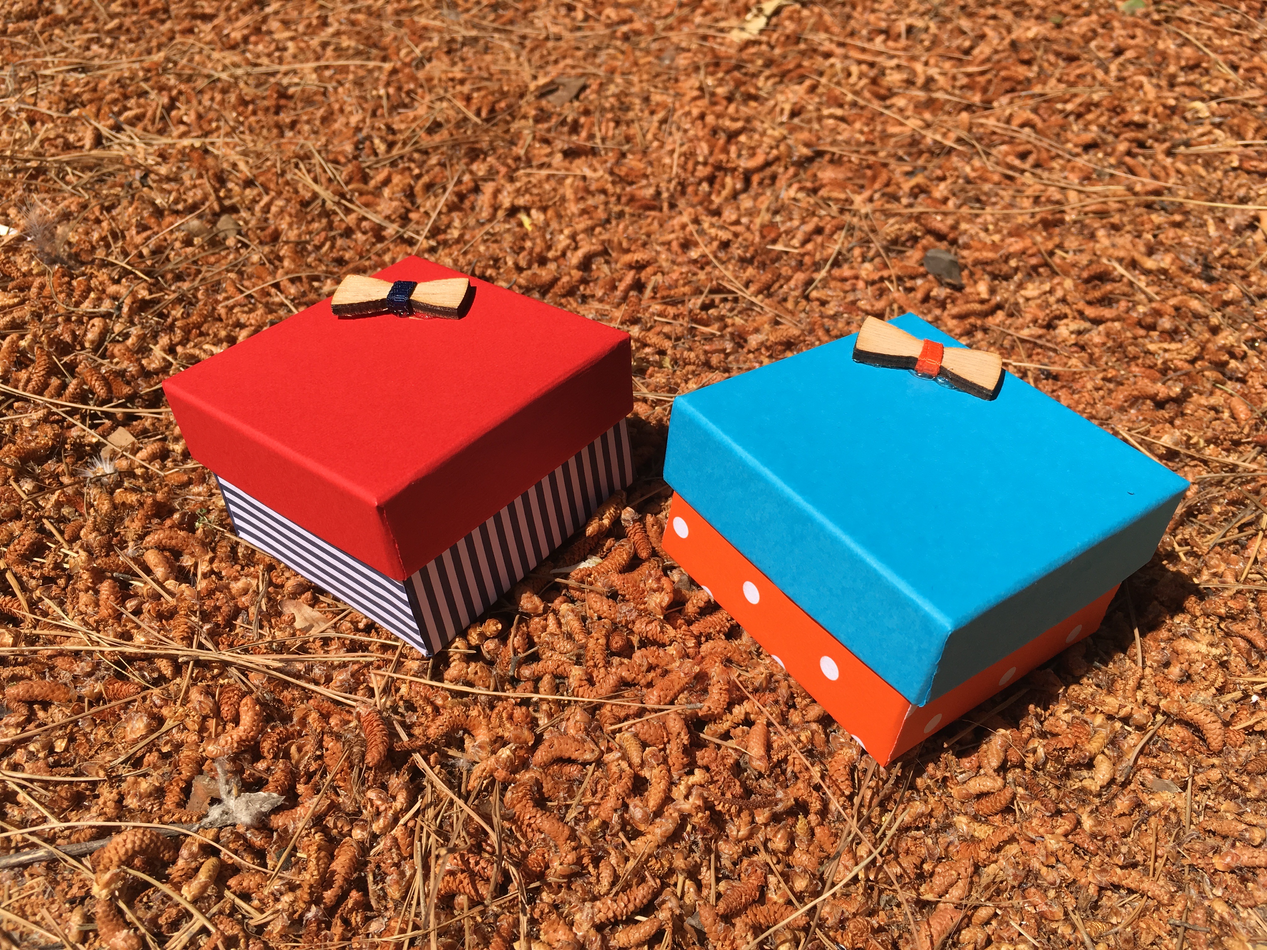Πόσο χρώμα είχε αυτή η βάφτιση! Μπλέ, πράσινο, κόκκινο, πορτοκαλί. Οι μπομπονιέρες φορούσαν και αυτές ένα ξύλινο παπιγιόν κολλημένο πάνω στο χρωματιστό χαρτί των μικρών κουτιών. Εύκολο να φτιαχτούν με χαρτόνια χειροτεχνείας, κόλλα, ψαλίδι και χάρακα! Μέσα κρύψαμε νόστιμα, πολύχρωμα σοκολατένια κουφετάκια!