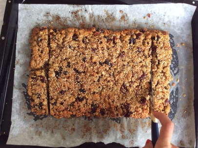 Τέλος, βγάζουμε το μείγμα απο το φούρνο και το αφήνουμε να κρυώσει και να στερεοποιηθεί. Μετά το κόβουμε σε παραλληλόγραμμα κομμάτια. Οι ενεργειακές μπάρες είναι έτοιμες και είναι πεντανόστιμες!