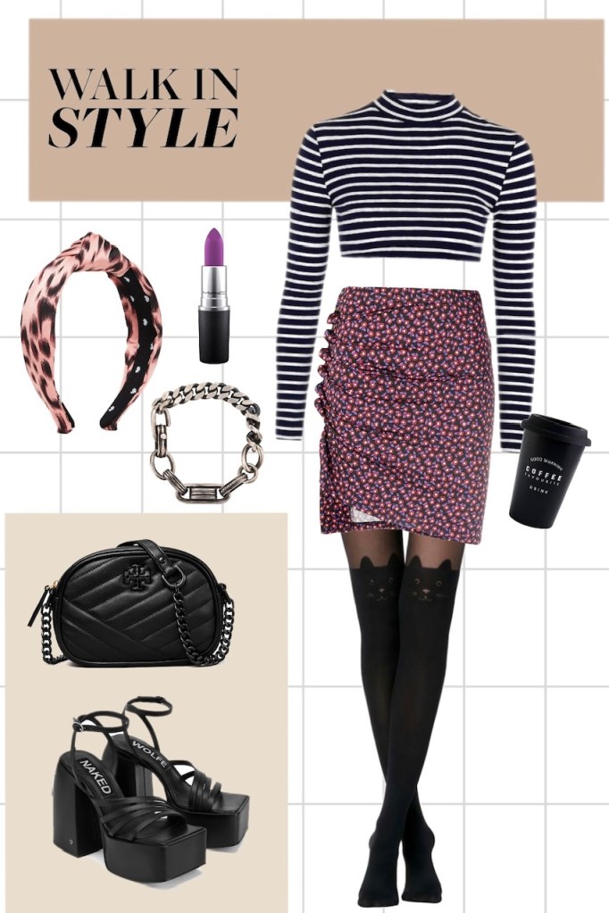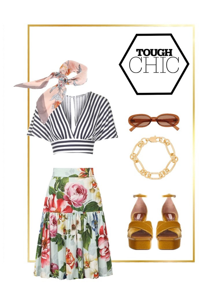 >Θέλεις ένα πιο κομψό all day outfit με σημασία στις λεπτομέριες και τα υλικά; Συνδύασε δύο patterns, όπως για παράδειγμα το ριγέ σε ένα crop top με το έντονο floral σε μια μακριά φούστα κάτω από το γόνατο. Στο σύνολο μην ξεχάσεις να προσθέσεις κομψά αξεσουάρ όπως ένα μεταξωτό φουλάρι, με ένα ήσυχο σχέδιο παρόμοιο με της φούστας είναι μια καλή ιδέα, και χρυσά κοσμήματα. Τα πέδιλα και τα γυαλιά θα συμπληρώσουν το στιλ δημιουργώντας μια vintage εικόνα. Ένα 60s touch είναι η πρόταση για αυτό το outfit και σίγουρα θα σου ταιριάξει: