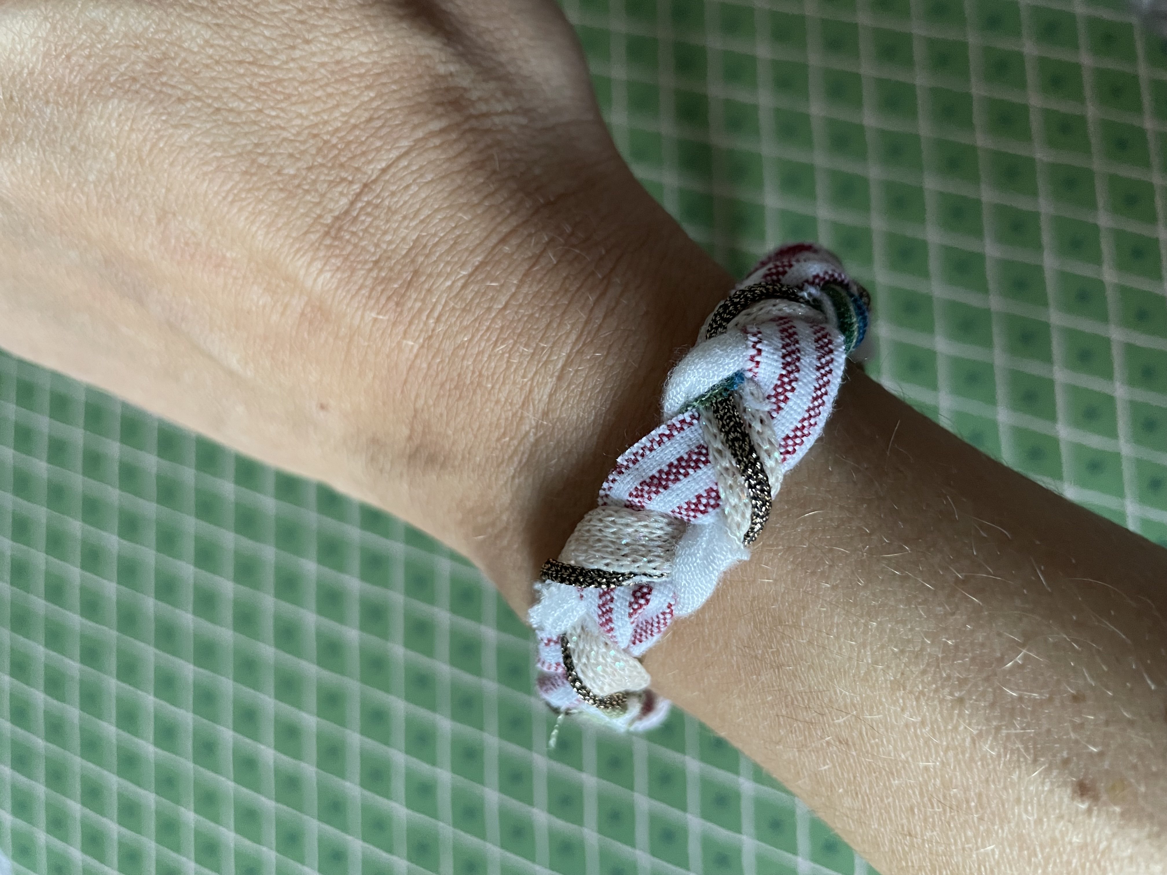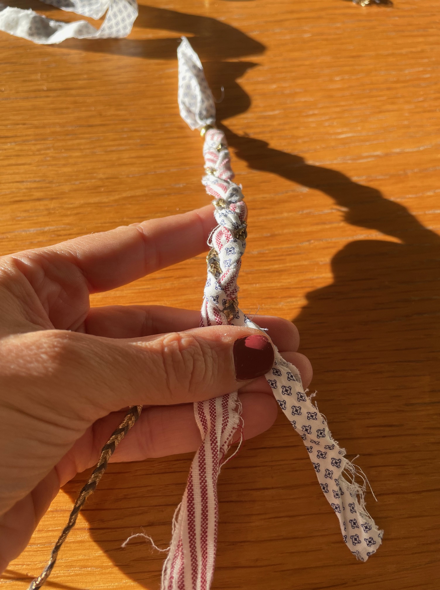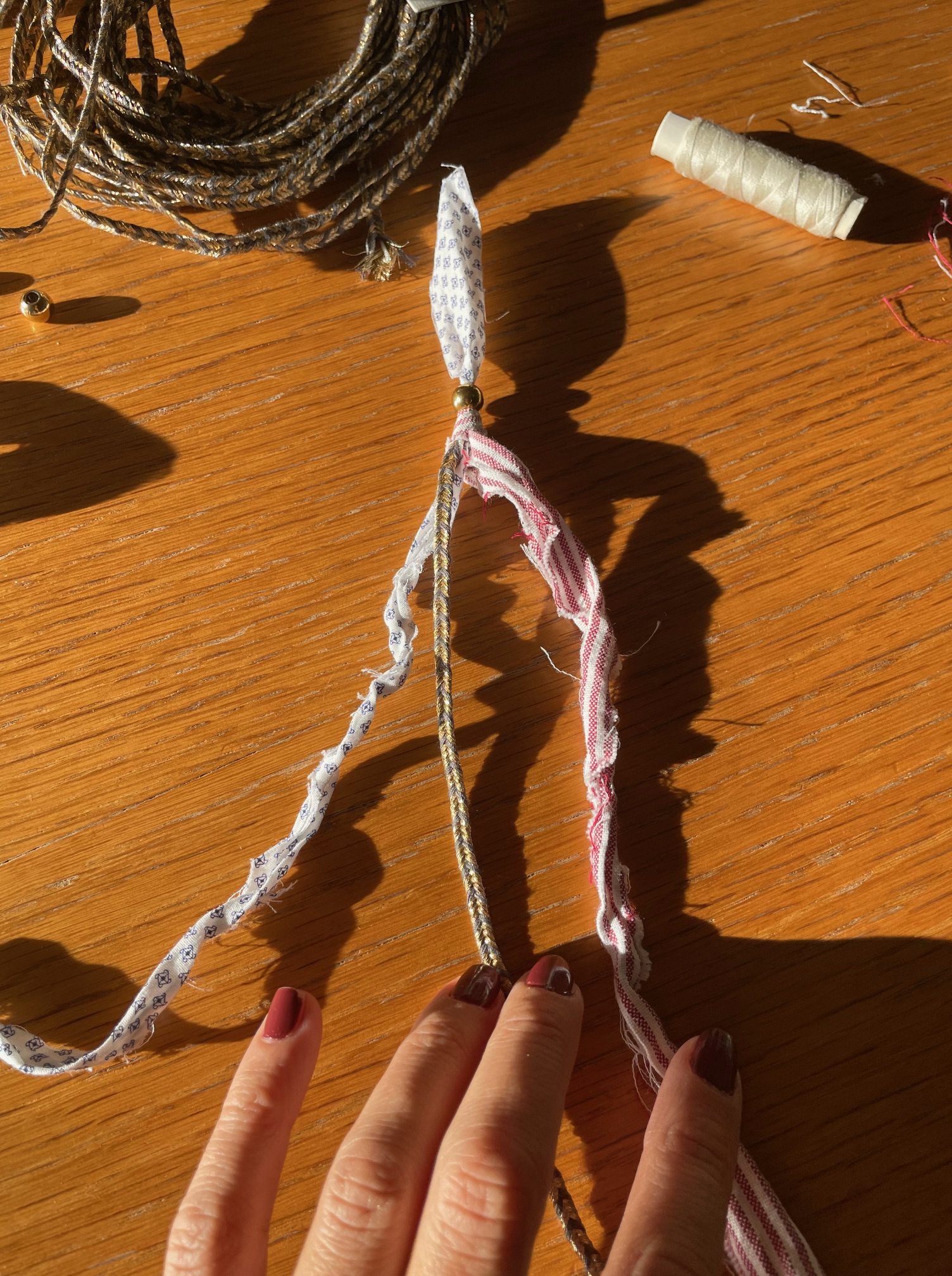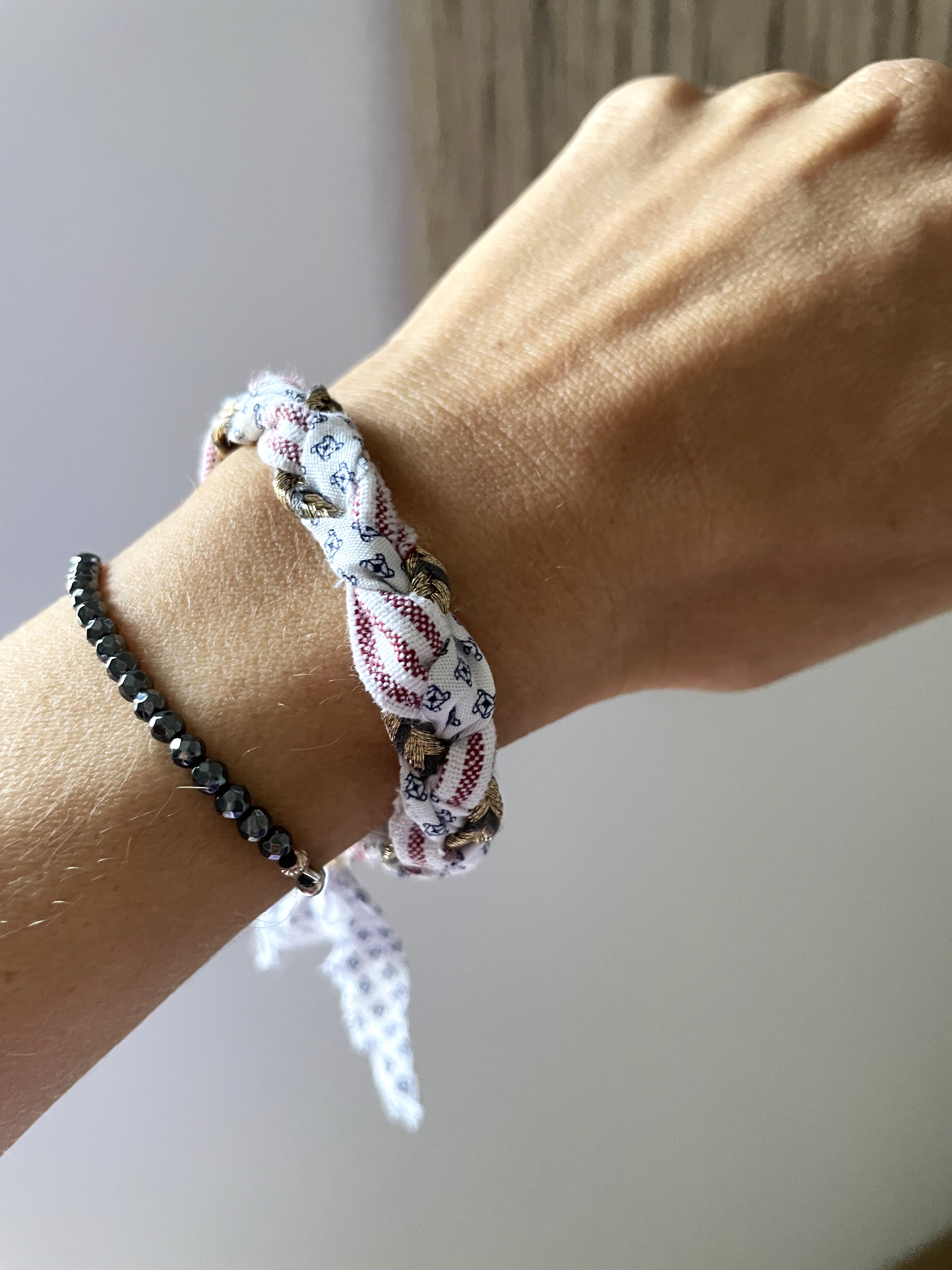 Φτιάχνετε μια πλεξούδα από διαφορετικές λωρίδες υφάσματος αφού τις έχετε στερεώσει καλά στη μια άκρη. Μπορείτε να χρησιμοποιήσετε και νήμα με διαφορετικά σχέδια για να δώσετε ιδιαίτερο στιλ και boho ύφος. Όταν τελειώσετε την πλεξούδα στερεώστε την άλλη άκρη και χρησιμοποιήστε κλωστή για να τη ράψετε. Περάστε μια χάντρα με τρύπα και στις δύο άκρες για να ρυθμίζετε το μήκος του βραχιολιού.