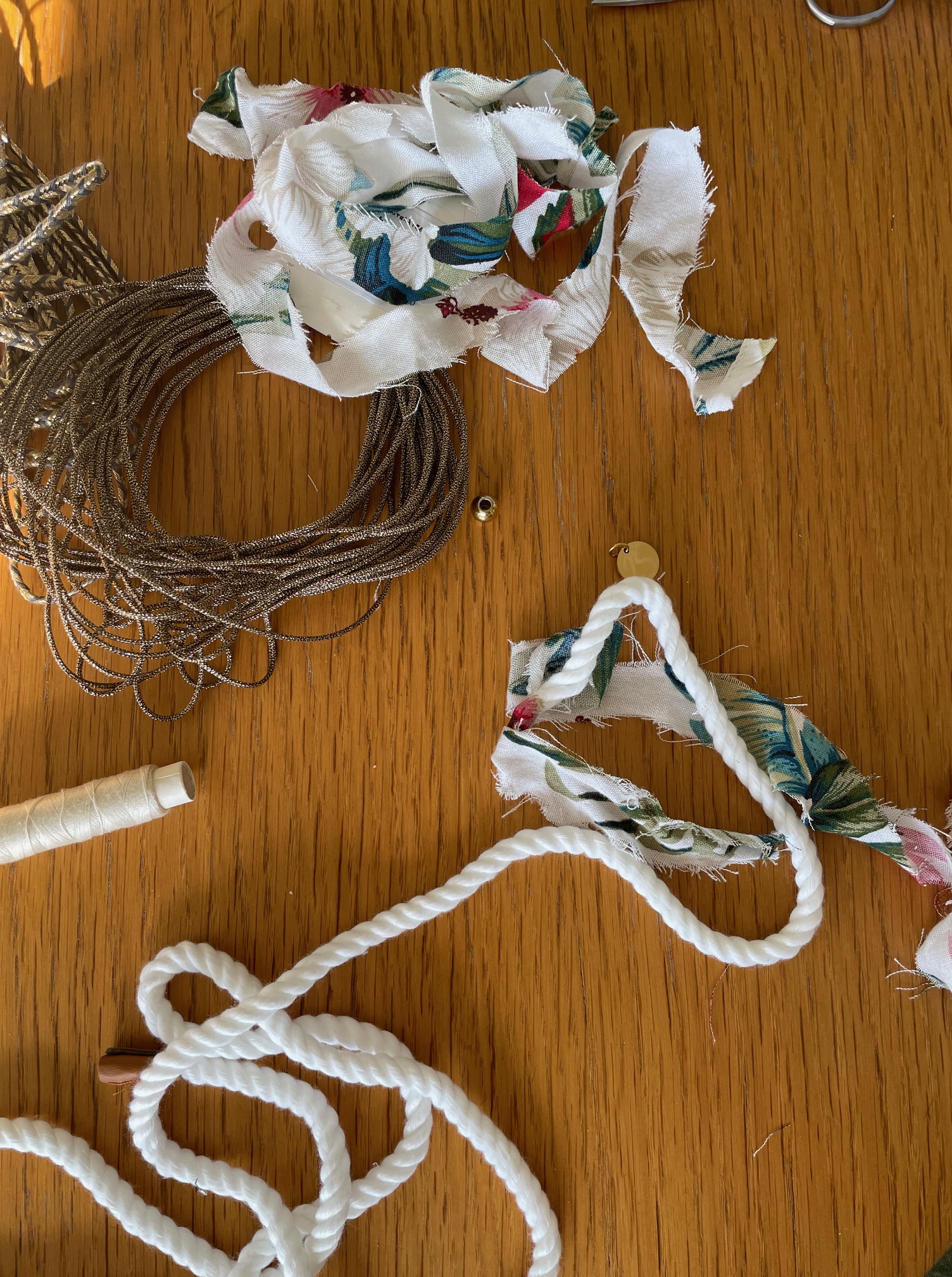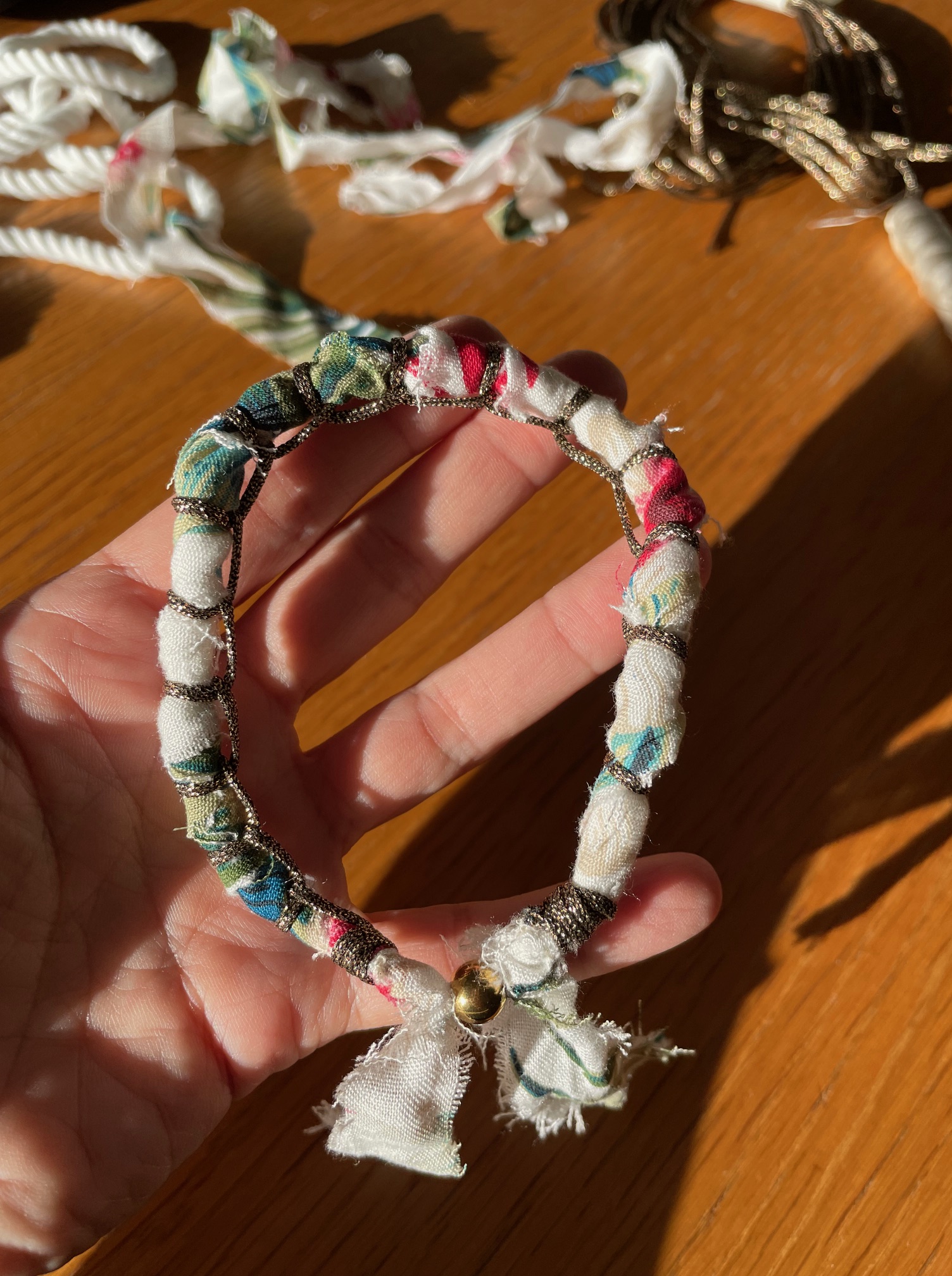 Ένας τρόπος να φτιάξετε βραχιόλια από ύφασμα είναι να πάρετε χοντρό νήμα και να αρχίσετε να τυλίγετε λωρίδες υφάσματος γύρω από το νήμα. Μπορείτε να τις στερεώσετε καλύτερα με κλωστή ενδιάμεσα και στις δύο άκρες του βραχιολιού. Εμείς χρησιμοποιήσαμε και λεπτό χρυσό νήμα για να κάνουμε ένα σχέδιο κατά μήκος του βραχιολιού, σαν να το κεντάμε. Στις άκρες στερεώνουμε καλά με έναν κόμπο, βάζουμε μια χάντρα με τρύπα και περνάμε από μέσα το ύφασμα ώστε να μπορεί να ρυθμίζεται το μέγεθος του βραχιολιού. Έτοιμο!