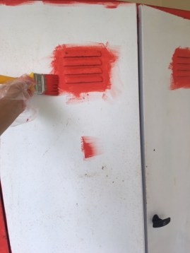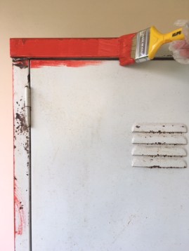 4. Περνάω όλη την επιφάνεια της ντουλάπας και εσωτερικά όπου χρειάζεται με 1 ή 2 στρώσεις αντισκωριακό μίνιο, κατά της οξείδωσης των μετάλλων. Αν είναι πολύ πηκτό μπορεί να χρειαστεί να αραιωθεί με νέφτι (white spirit). Αφήνω να στεγνώσει καλά. Προσοχή να φοράτε γάντια!