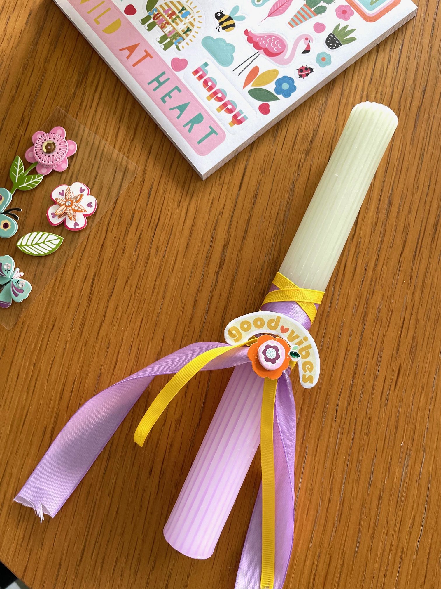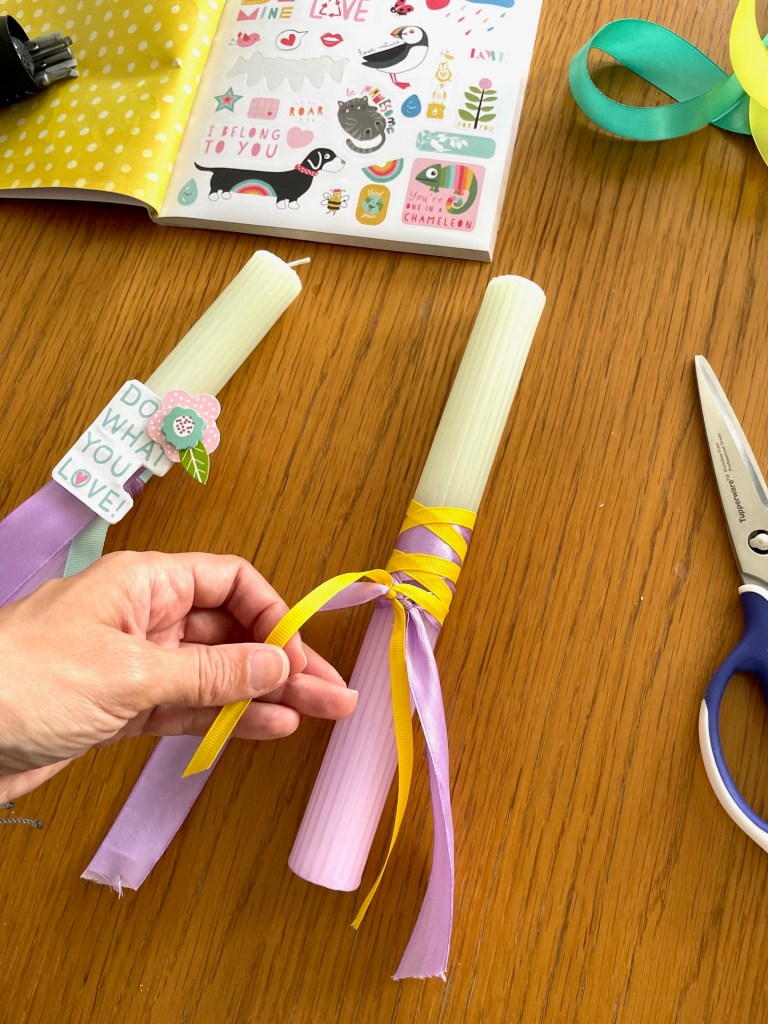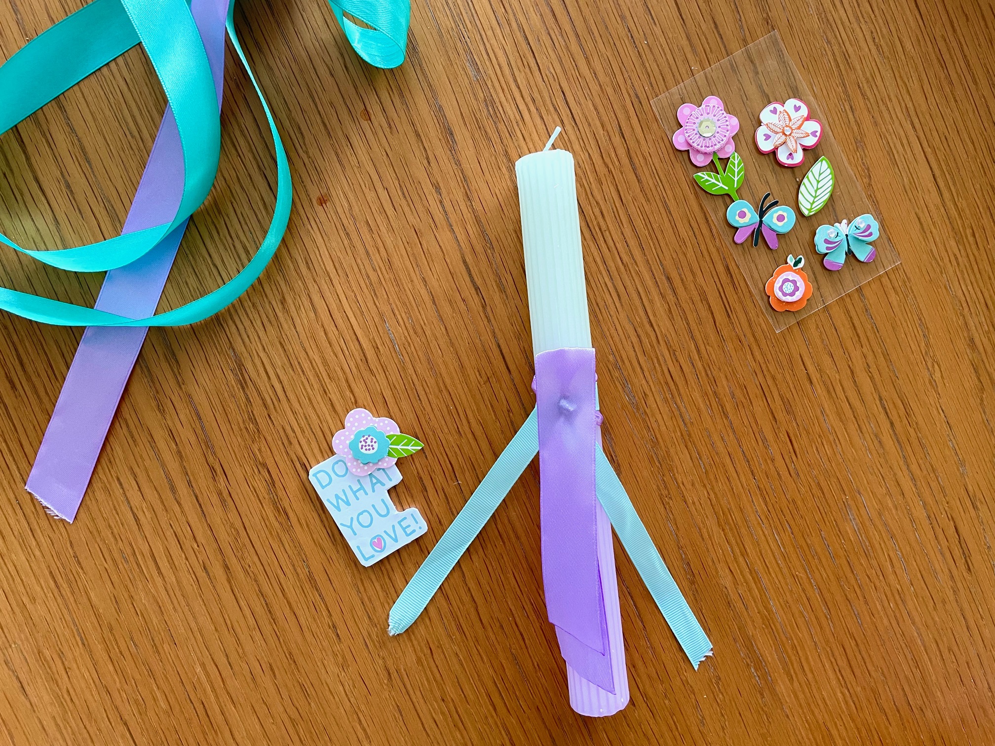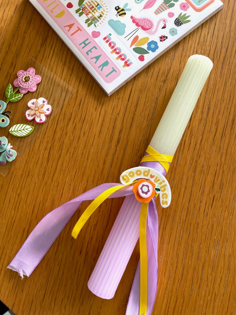 Έτσι λοιπόν χρησιμοποιήσαμε μοβ, γαλάζιες και κίτρινες κορδέλες πάνω σε κεριά όμπρε. Αποφασίσαμε να κολλήσουμε χαρούμενα μηνύματα και να τα συνοδεύσουμε με χάρτινα λουλούδια που προμηθευτήκαμε από βιβλιοπωλείο.
