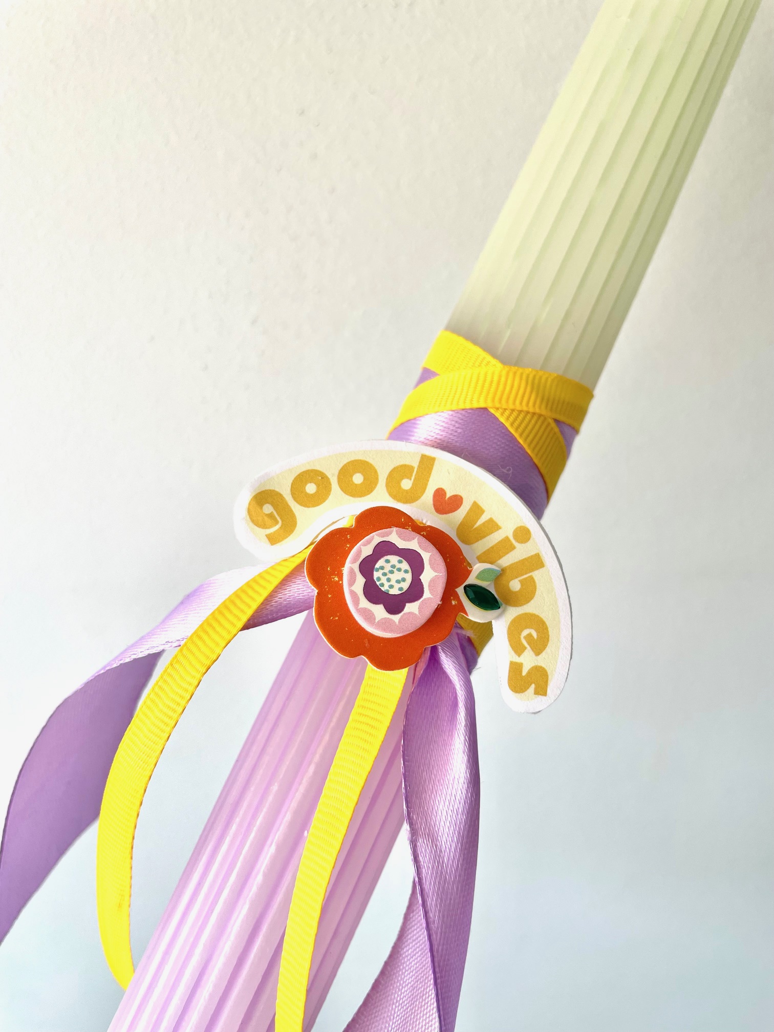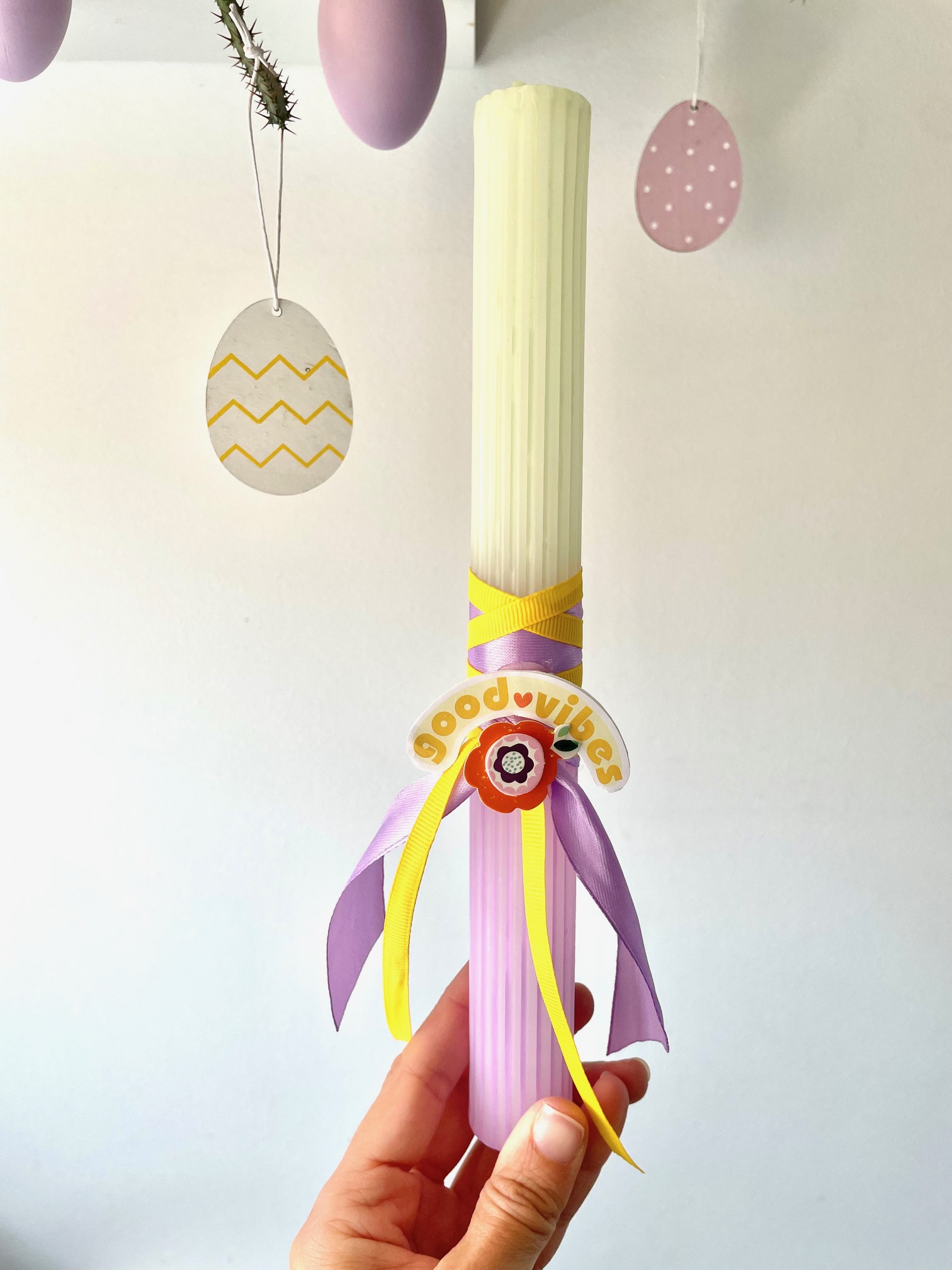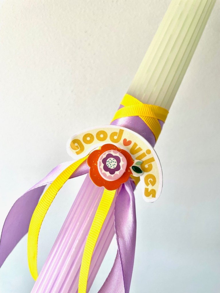 Έτσι λοιπόν χρησιμοποιήσαμε μοβ, γαλάζιες και κίτρινες κορδέλες πάνω σε κεριά όμπρε. Αποφασίσαμε να κολλήσουμε χαρούμενα μηνύματα και να τα συνοδεύσουμε με χάρτινα λουλούδια που προμηθευτήκαμε από βιβλιοπωλείο.